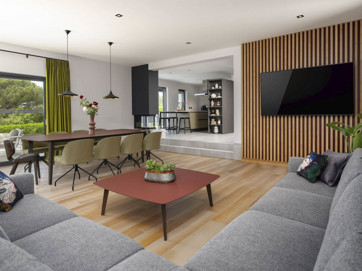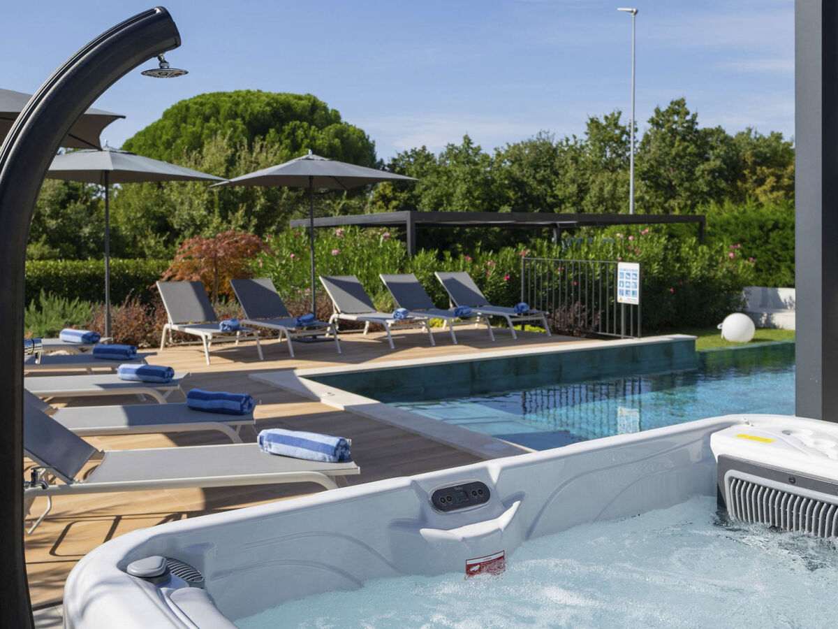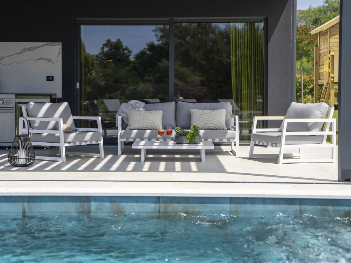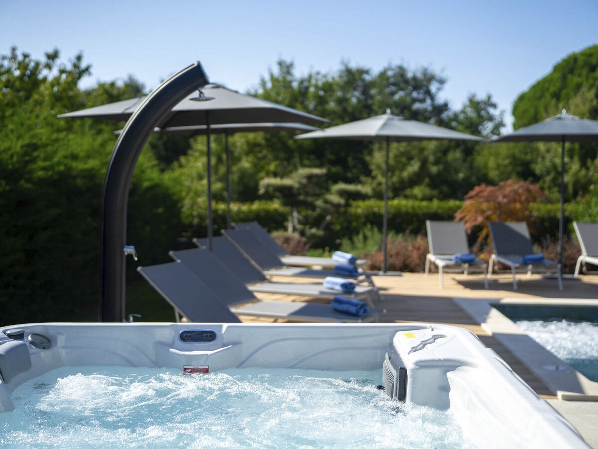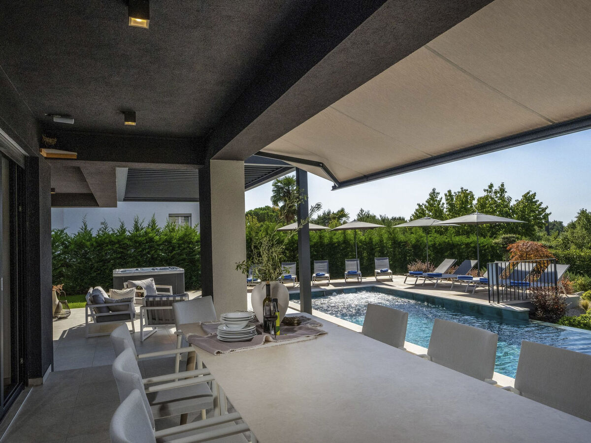 On the fenced and well-kept plot of 950 m² there is a 40 m² infinity pool with a hydromassage corner, jacuzzi, 10 sun loungers, three parasols, an outdoor kitchen with gas barbecue and fridge, a covered terrace with seating and a dining table, children's playground, table tennis and 3 parking spaces.