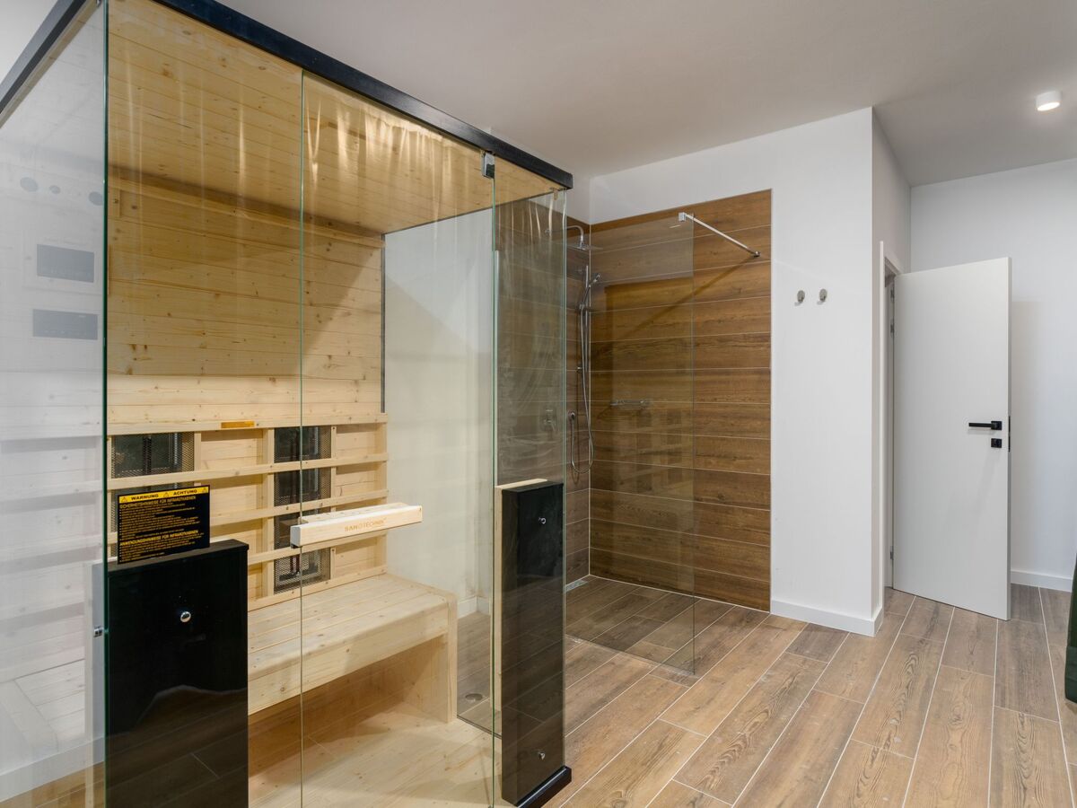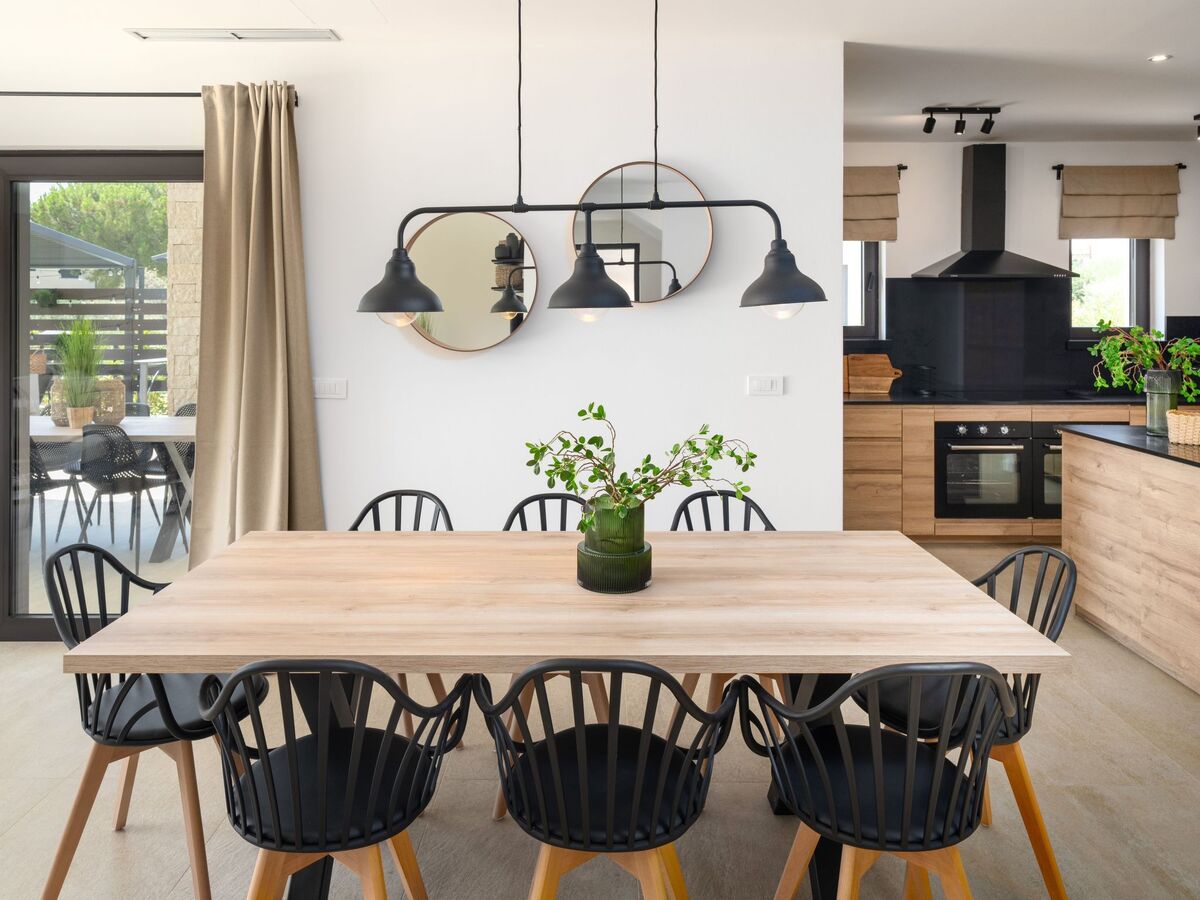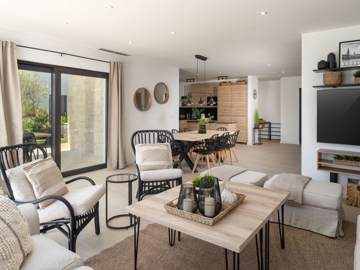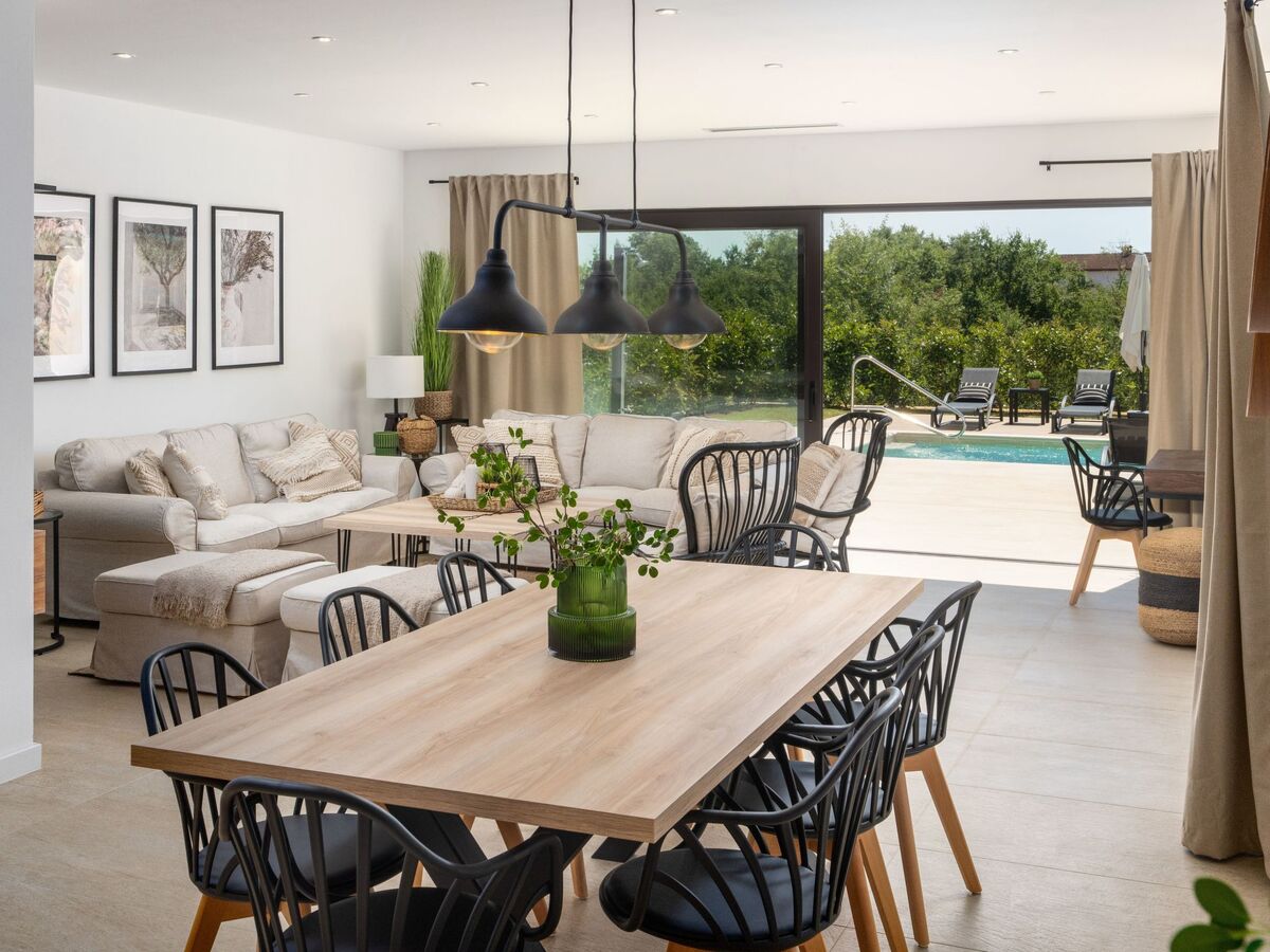 On the ground floor there is a spacious living room with access to the terrace and pool, a fully equipped kitchen, a dining table, and a separate toilet.