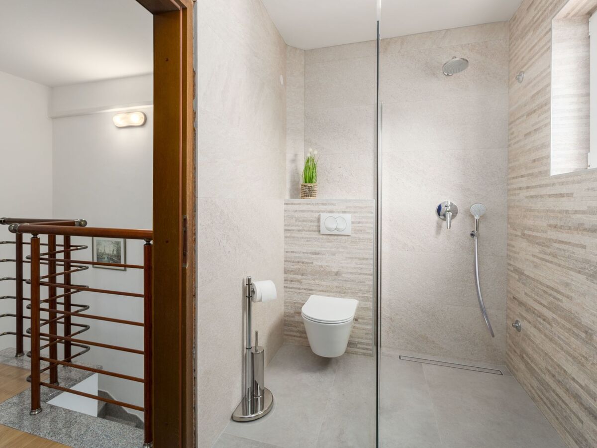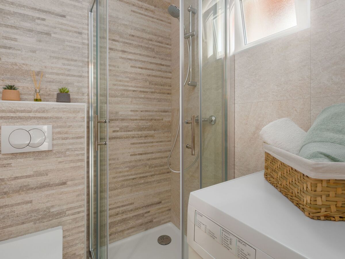 On the ground floor of the house there is a fully equipped kitchen, dining table and living room with access to the covered terrace with garden and garden furniture, and bathroom with shower/WC.