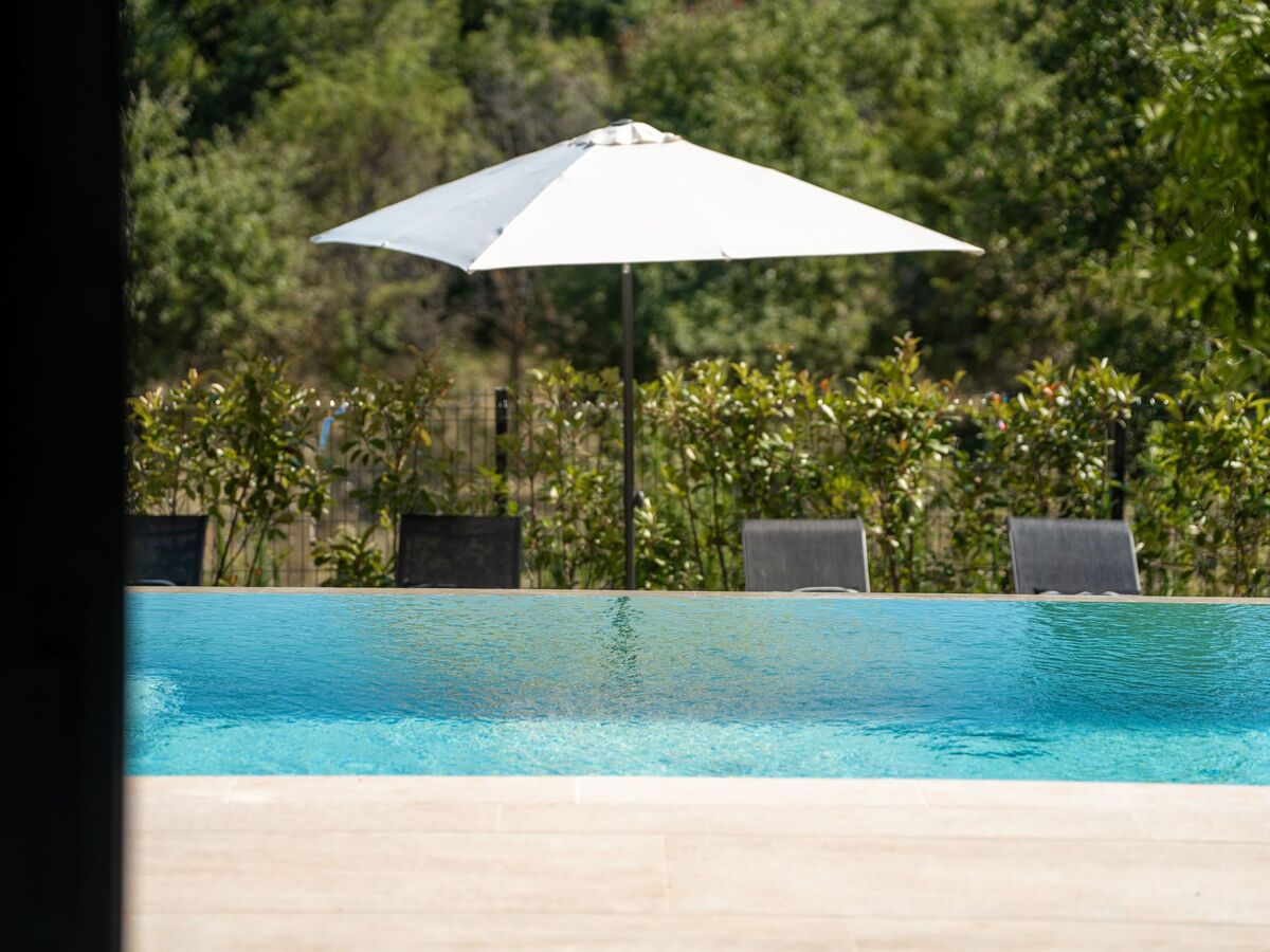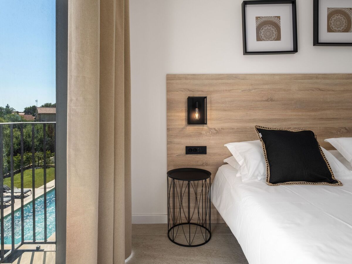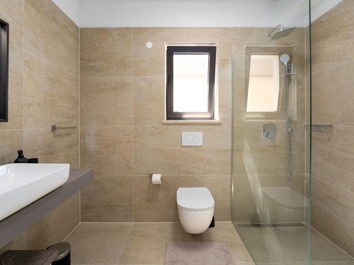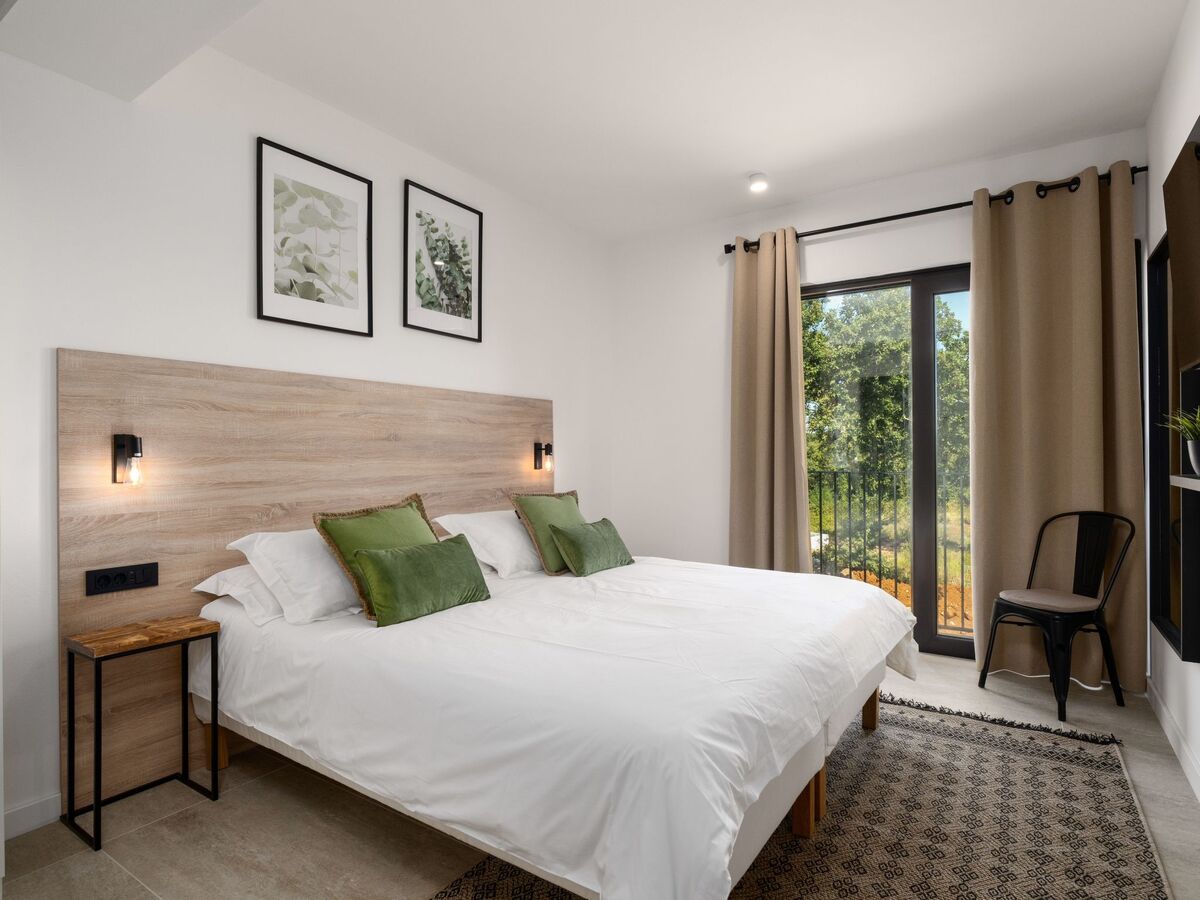 On the first floor of the house there are four bedrooms with double beds, each with its own shower/WC and small balcony overlooking the pool and the green surroundings.