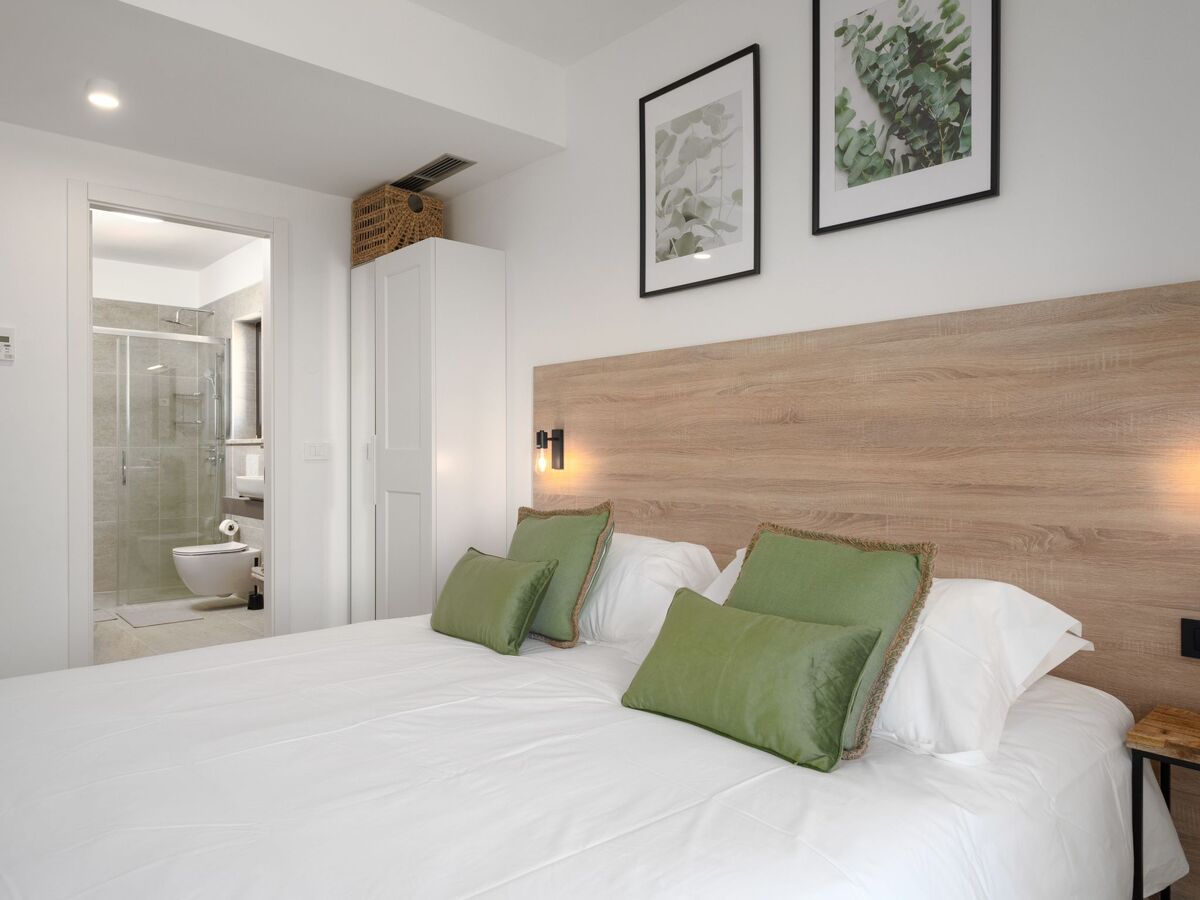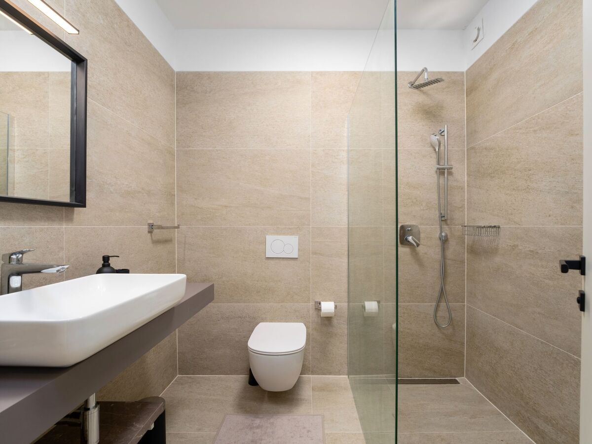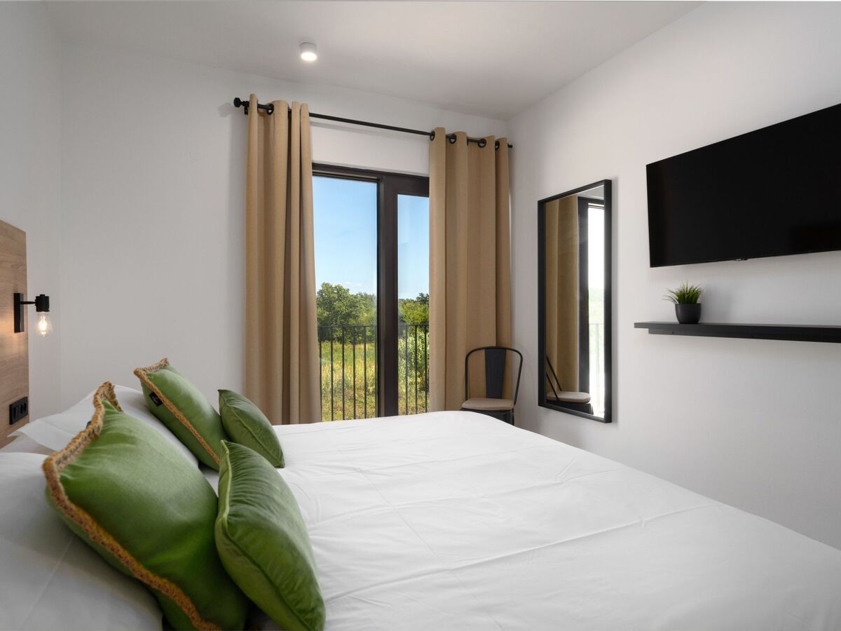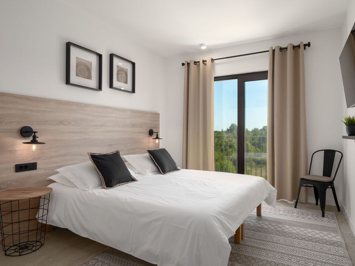On the first floor of the house there are four bedrooms with double beds, each with its own shower/WC and small balcony overlooking the pool and the green surroundings.