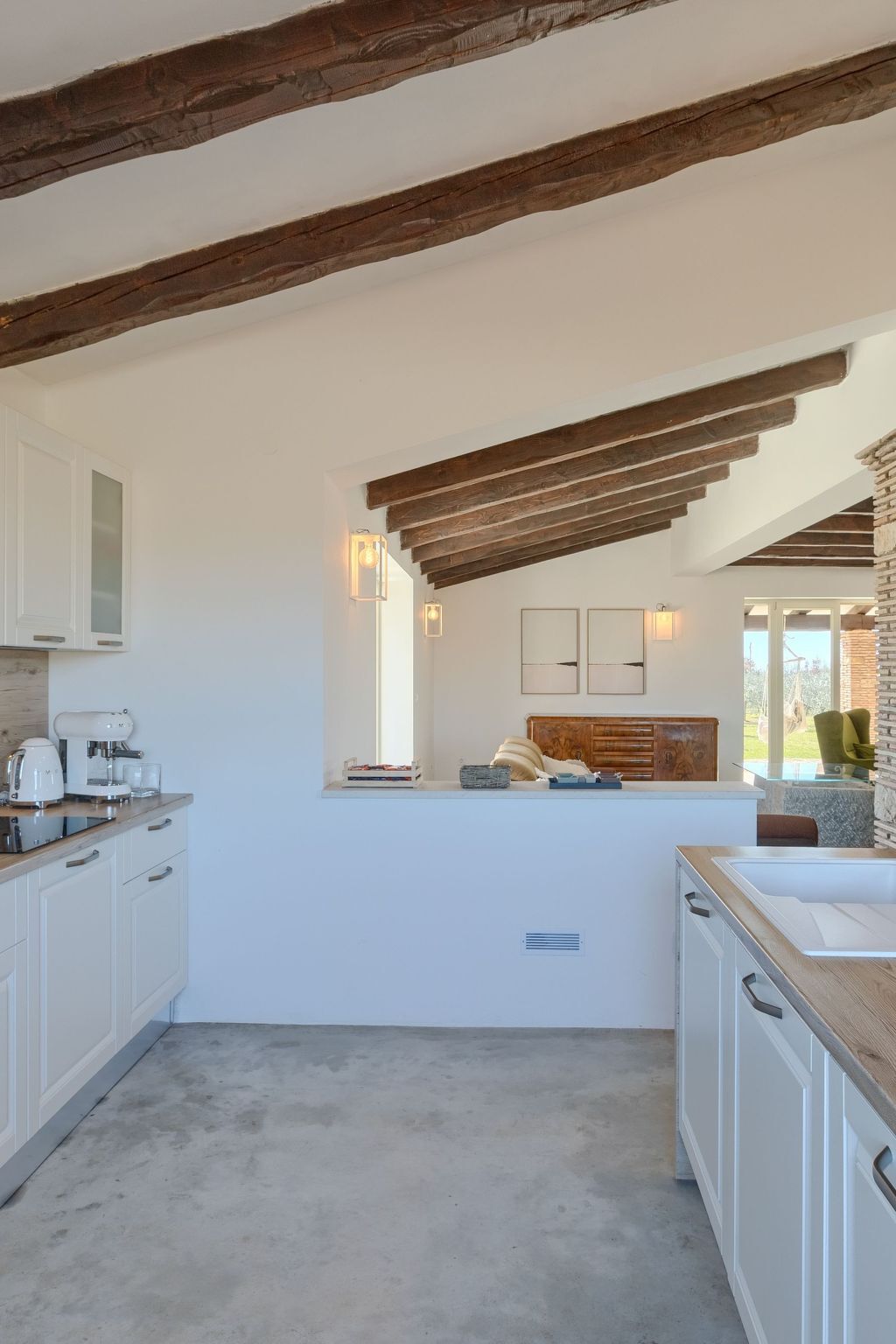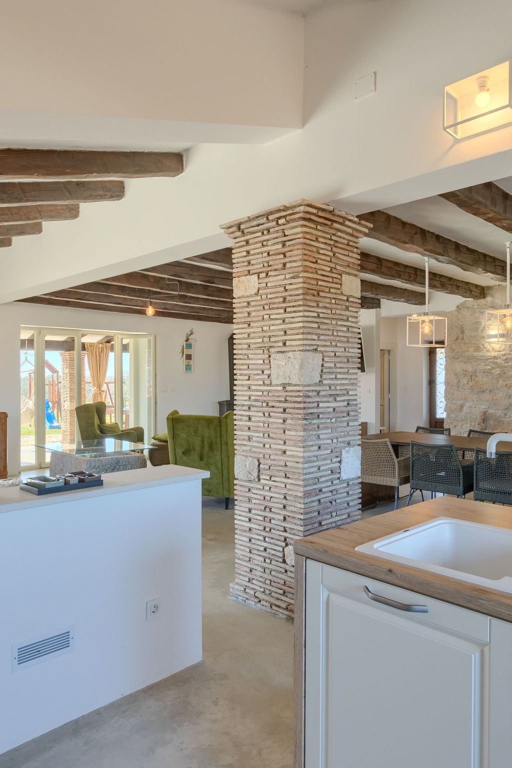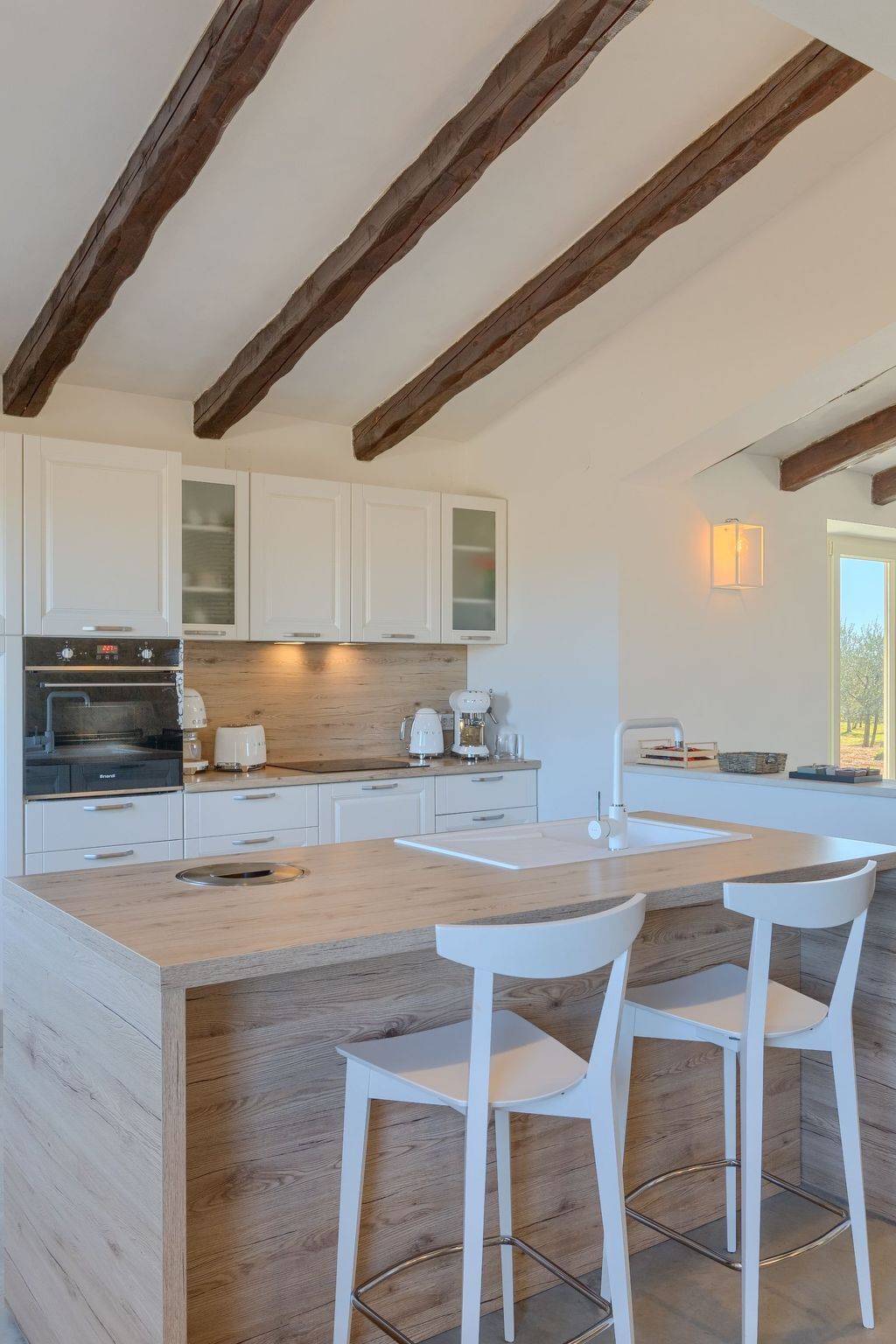 Inside, you will find a modern and fully equipped kitchen with an elegant island that invites you to cook together.