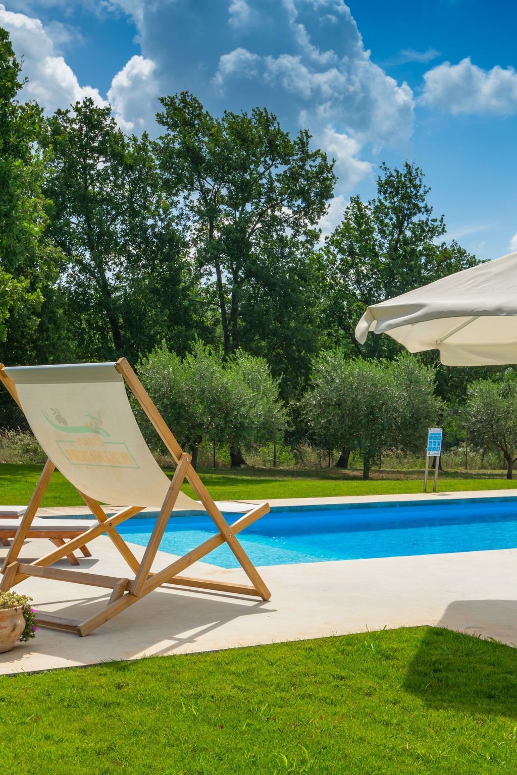 The outdoor area is a holiday dream come true with a spacious pool area surrounded by comfortable sun loungers and parasols.