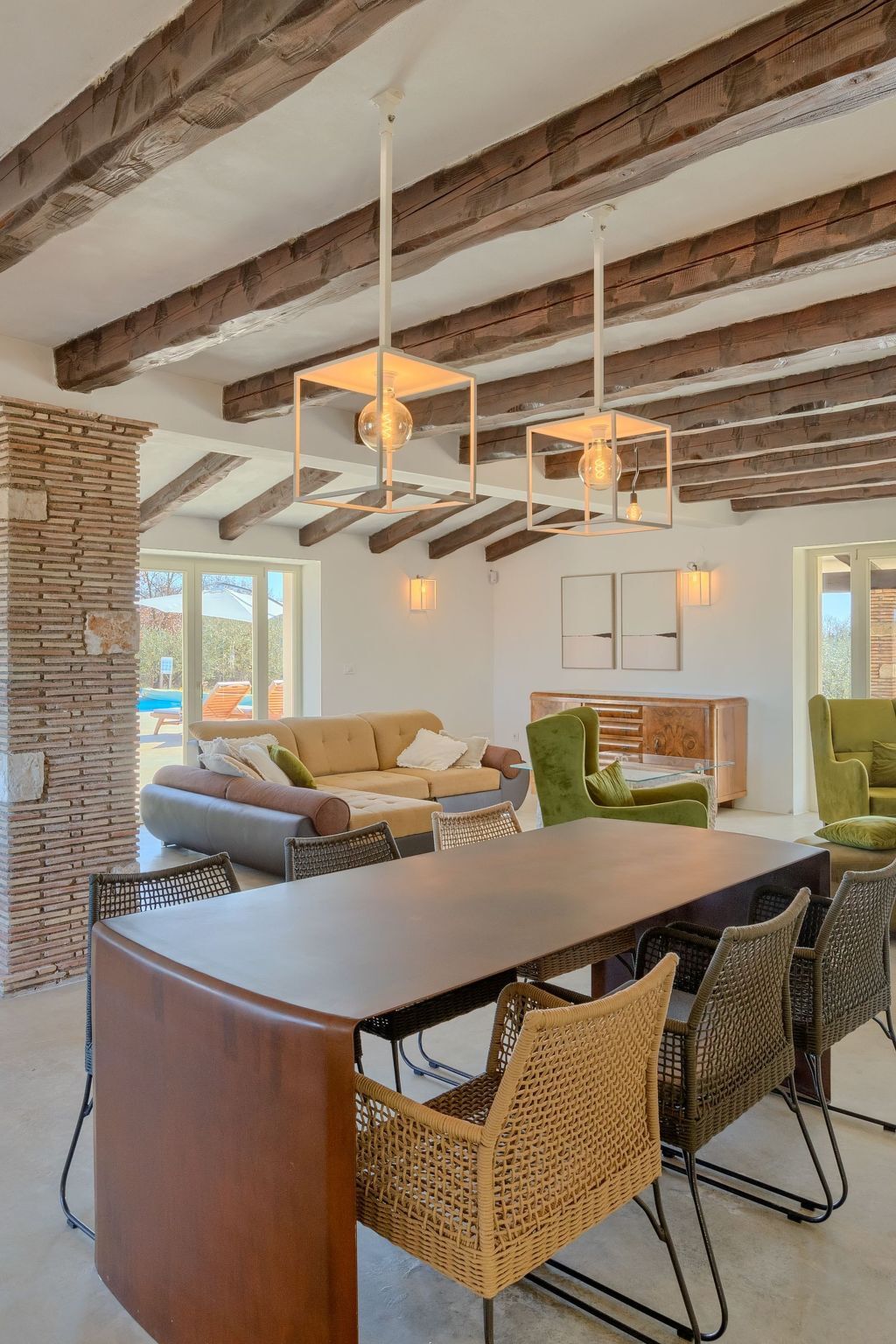 The spacious, open-plan living room is tastefully furnished with comfortable sofas and armchairs, ideal for relaxing and socialising.