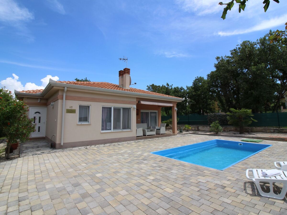 This modern single-storey house with a total area of 120 m² consists of a spacious living room with a fully equipped kitchen and a dining table, a living room with access to a covered terrace with seating, two bedrooms with double beds and a bathroom with a shower/toilet.