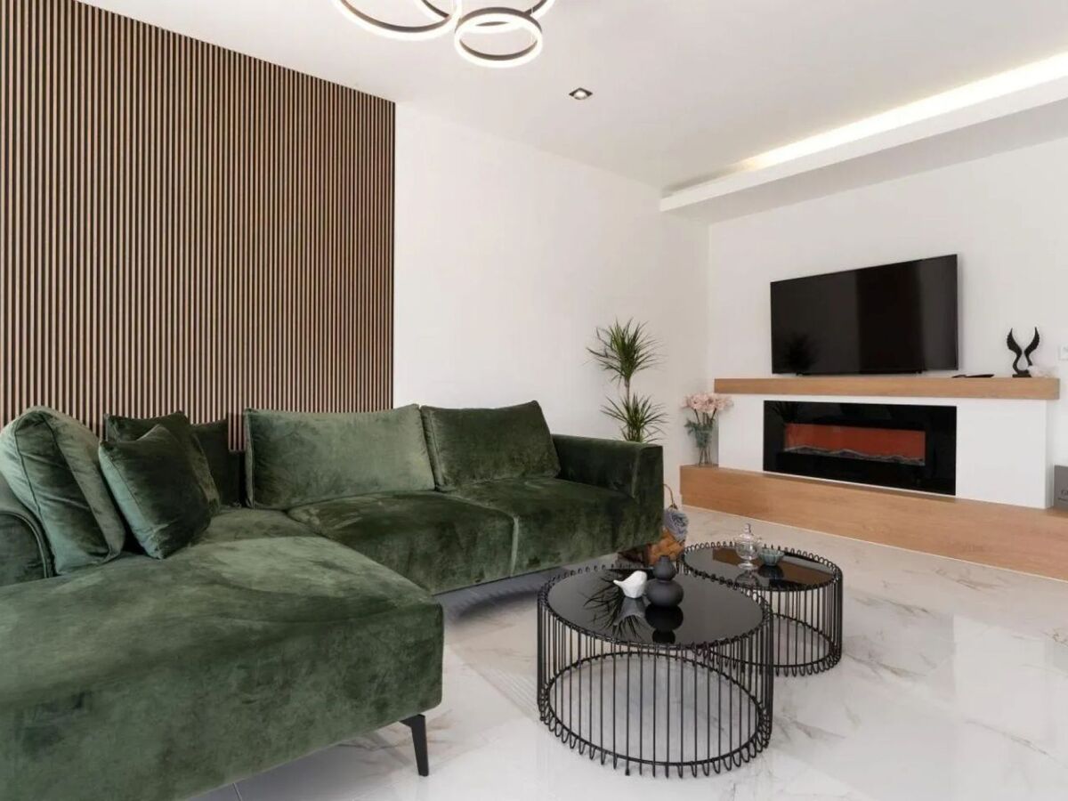On the ground floor there is a modern furnished living area with a large sofa and Smart TV where you can relax after a day in the sun.