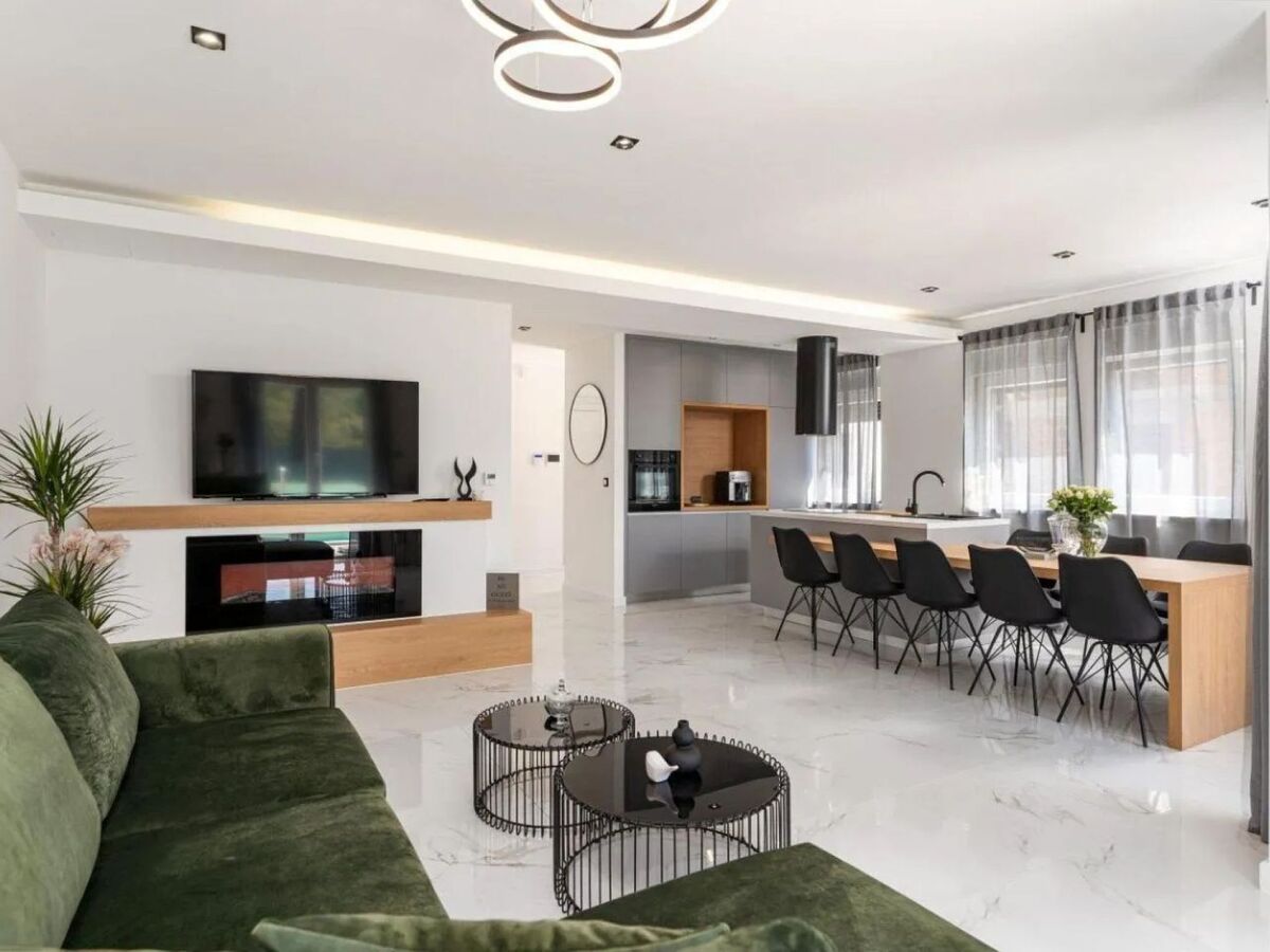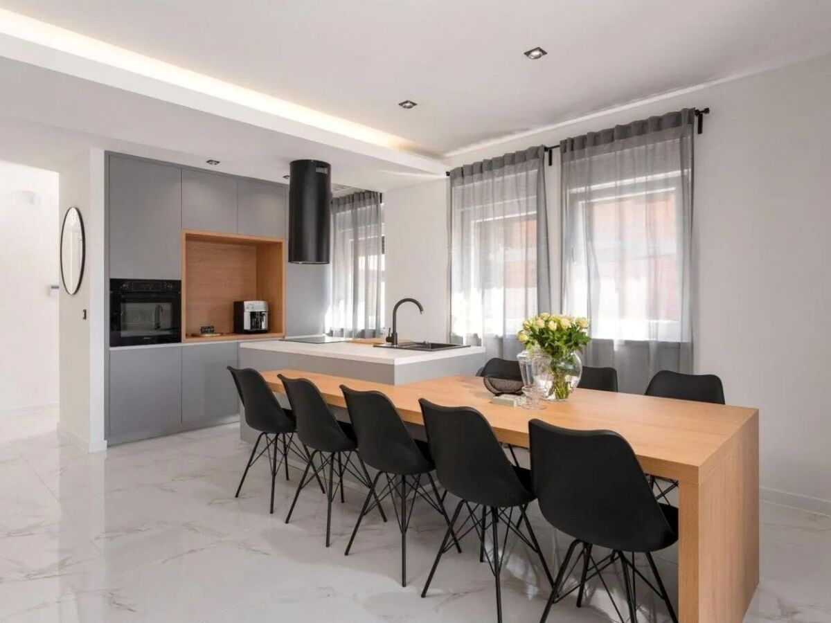 A dining table connects the living area with a modern and fully equipped kitchen.