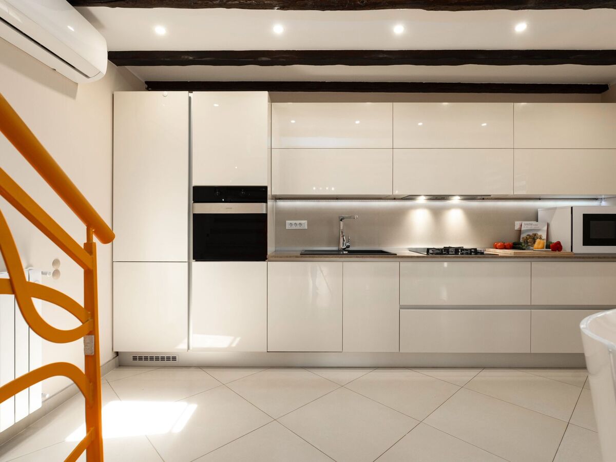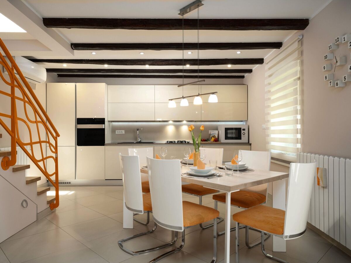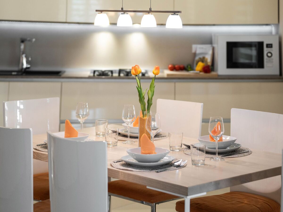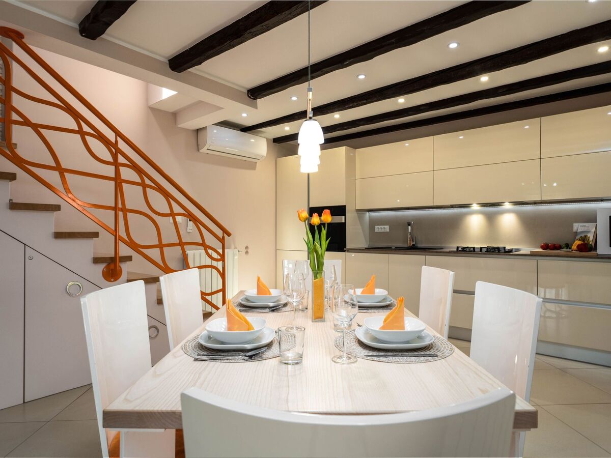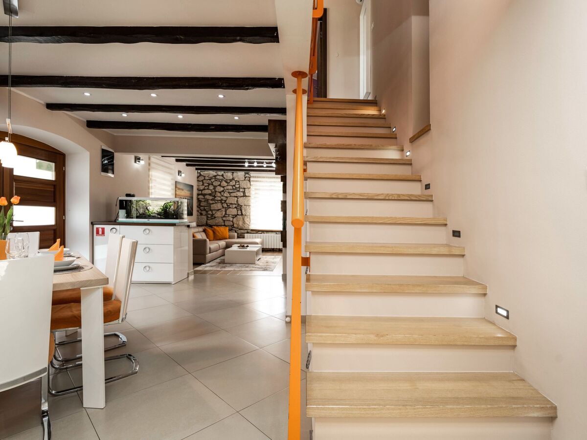 On the ground floor there is a living area with a fully equipped kitchen, a dining table, living room, and a separate toilet.