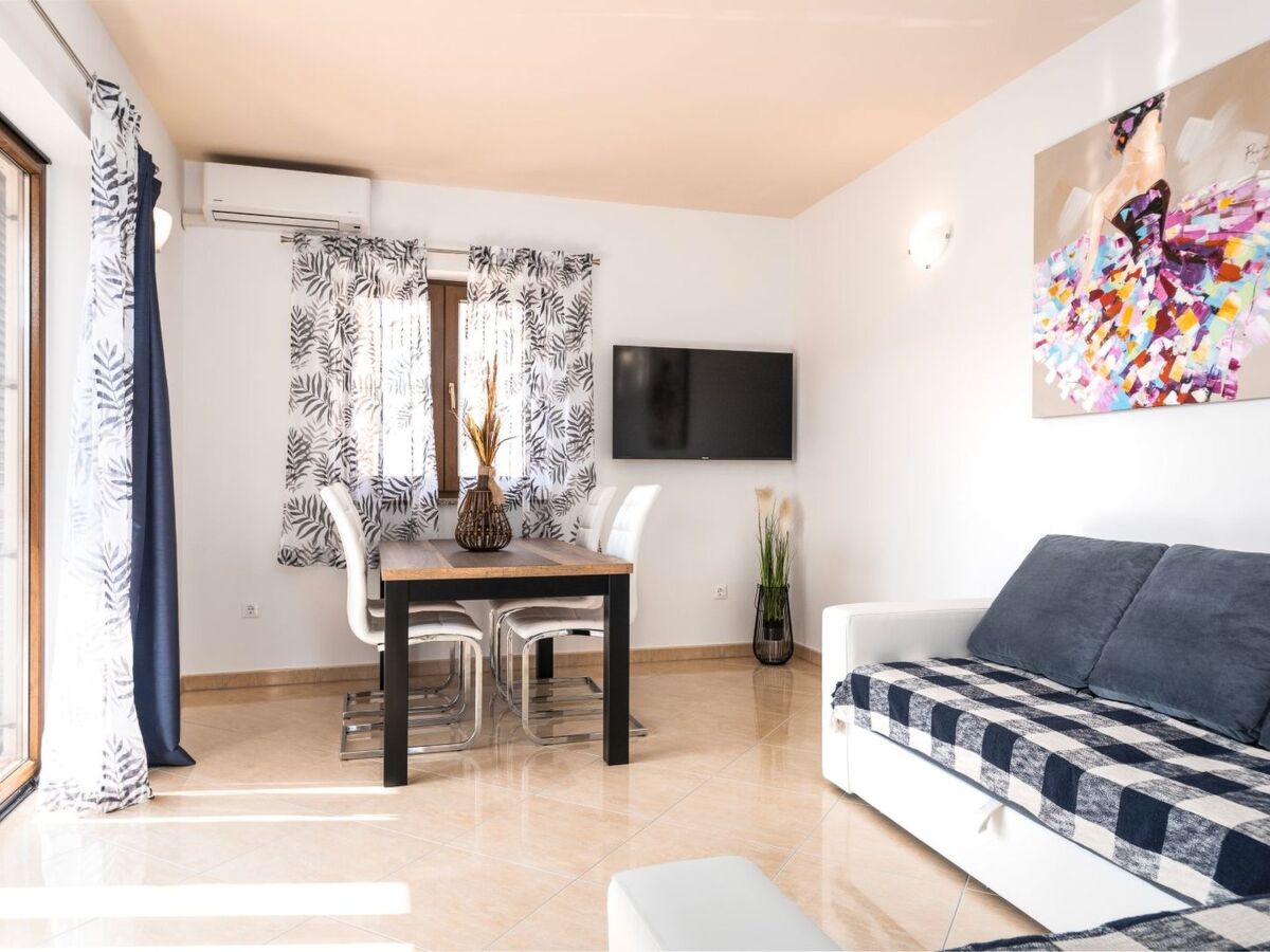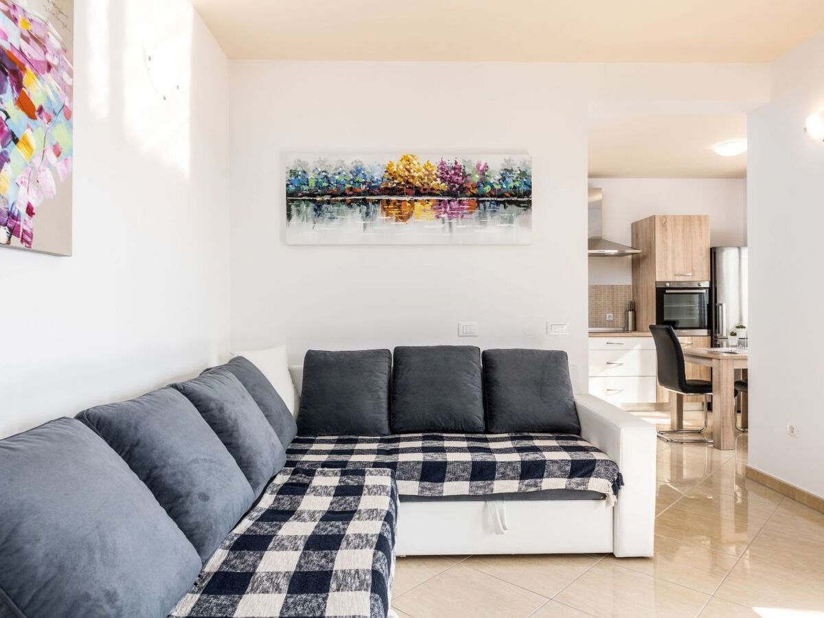 Living room with a big resizable sofa bed for 2 persons and dining table, a fully equipped kitchen, bathroom.