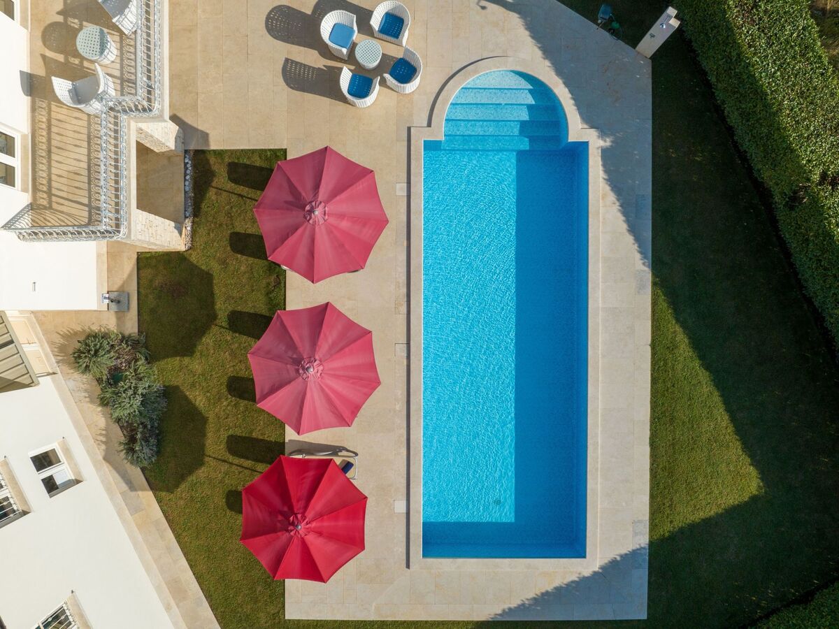 The living room leads directly to the terrace and pool, surrounded by greenery.