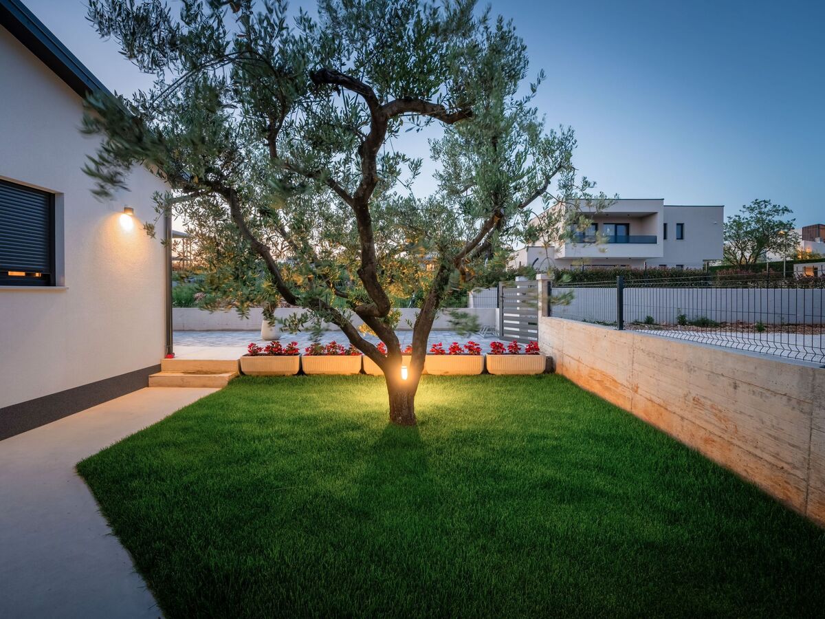 The villa's well-kept outdoor area is dominated by a 950m² private, fenced plot with carefully landscaped lawn and surrounded by picturesque olive trees.