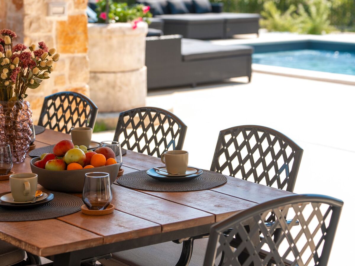 Next to the pool there is a beautiful covered terrace with a large table and barbecue, while there are several parking spaces in the courtyard.
