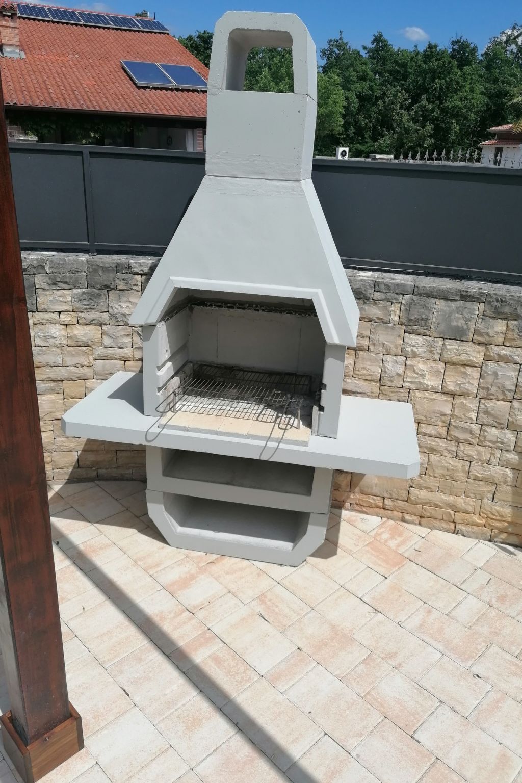 The dining and living room provide access to the terrace, with a grill chimney and garden furniture.