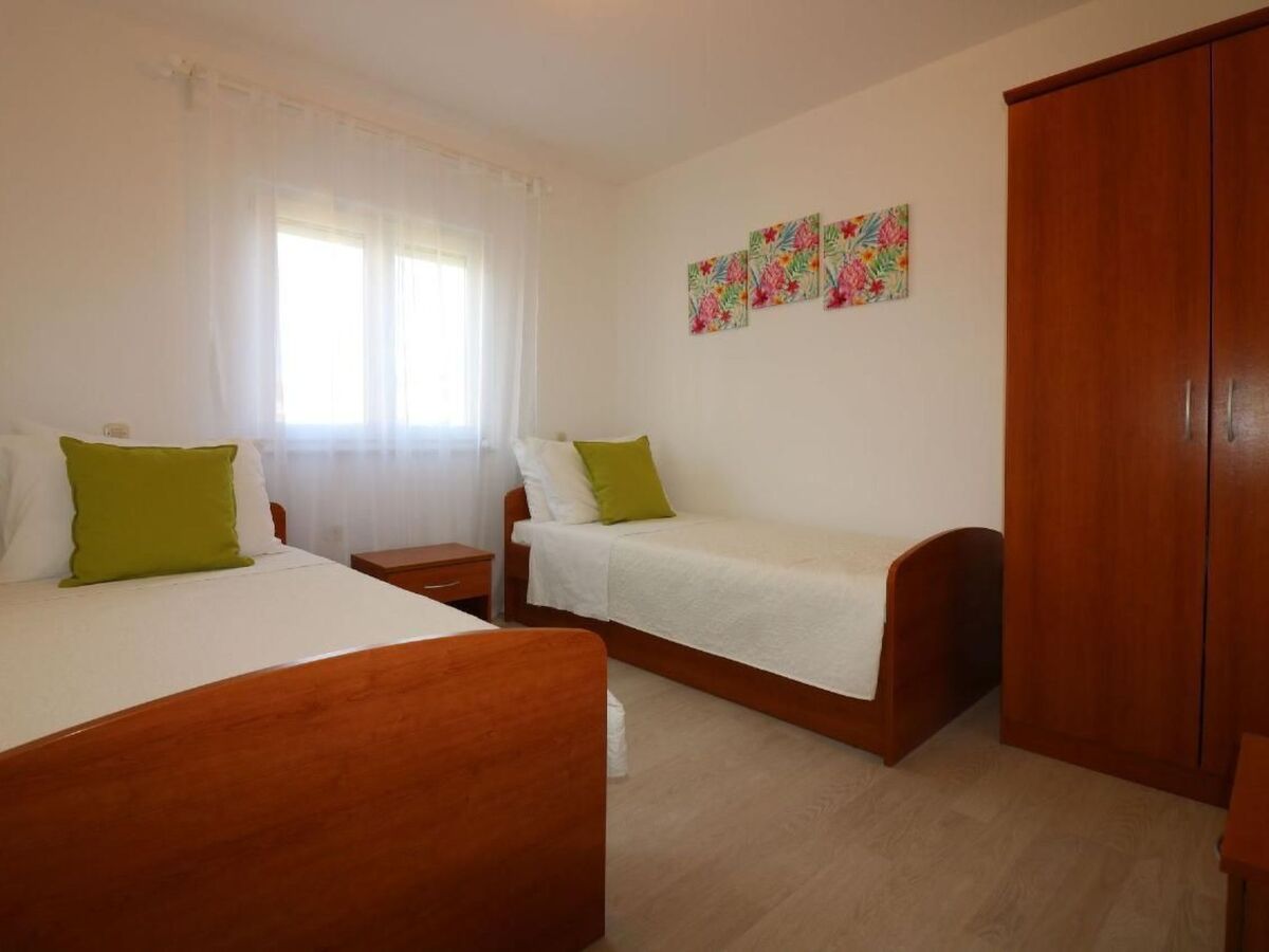 The bungalow has two bedrooms, one with a double bed and the other with two single beds.