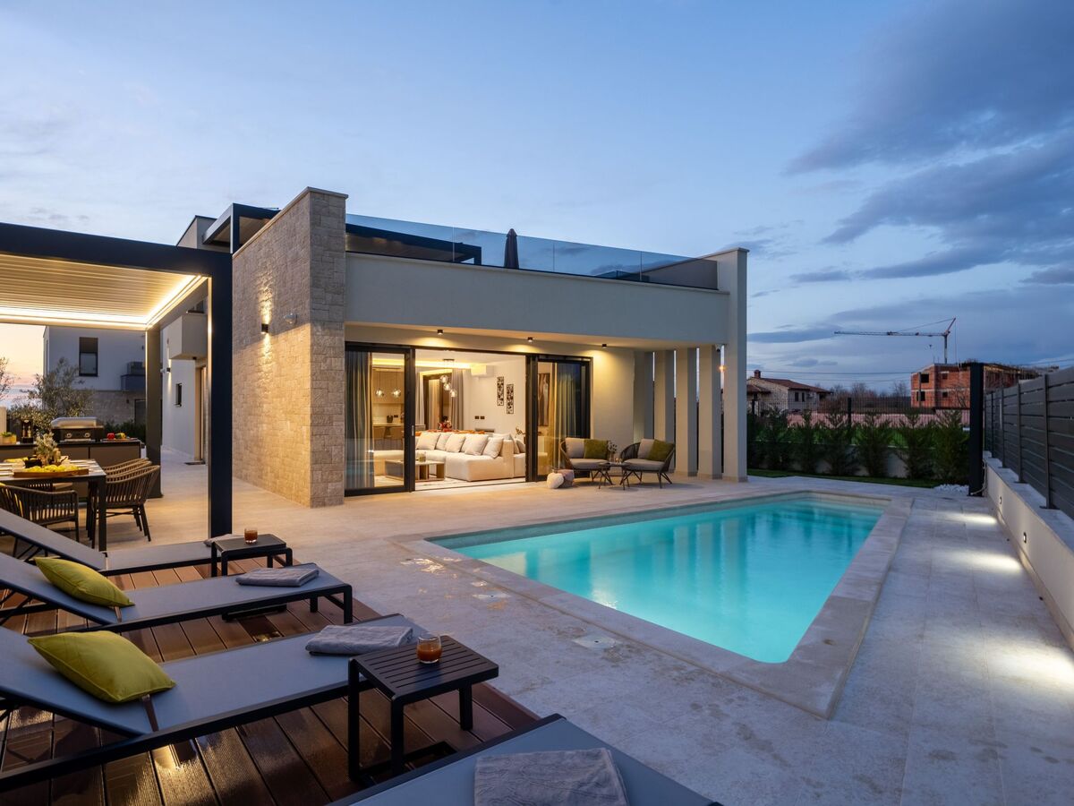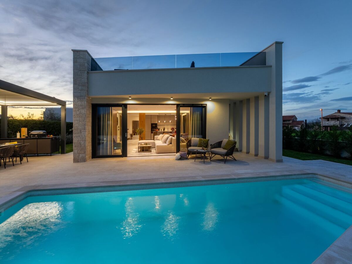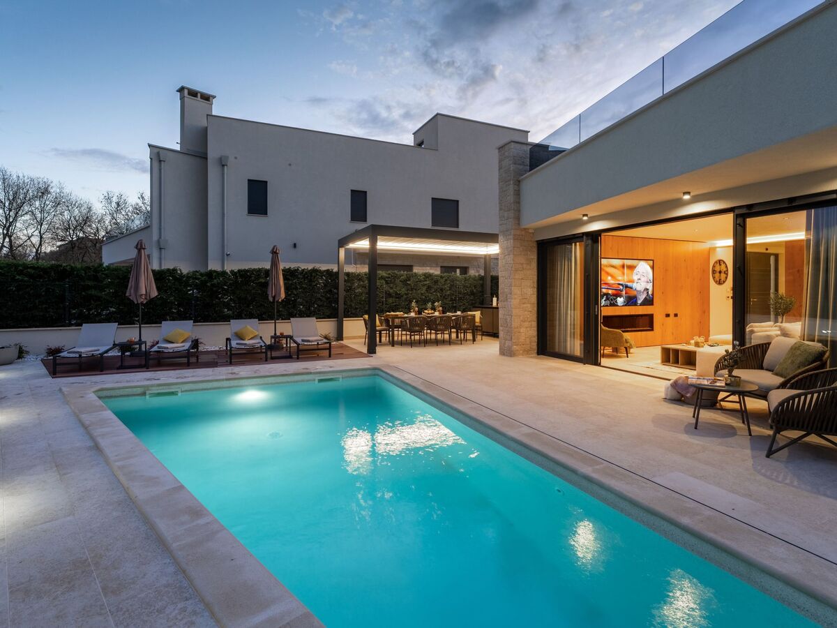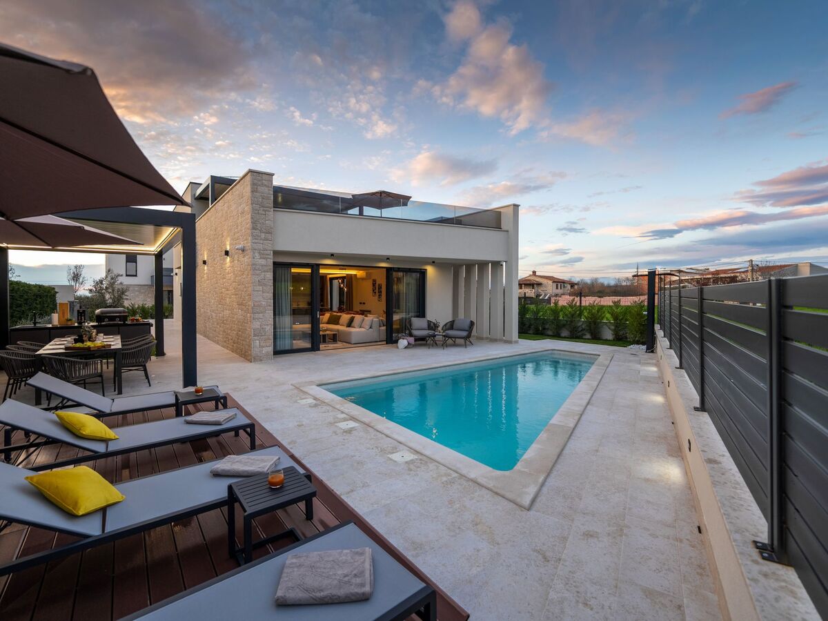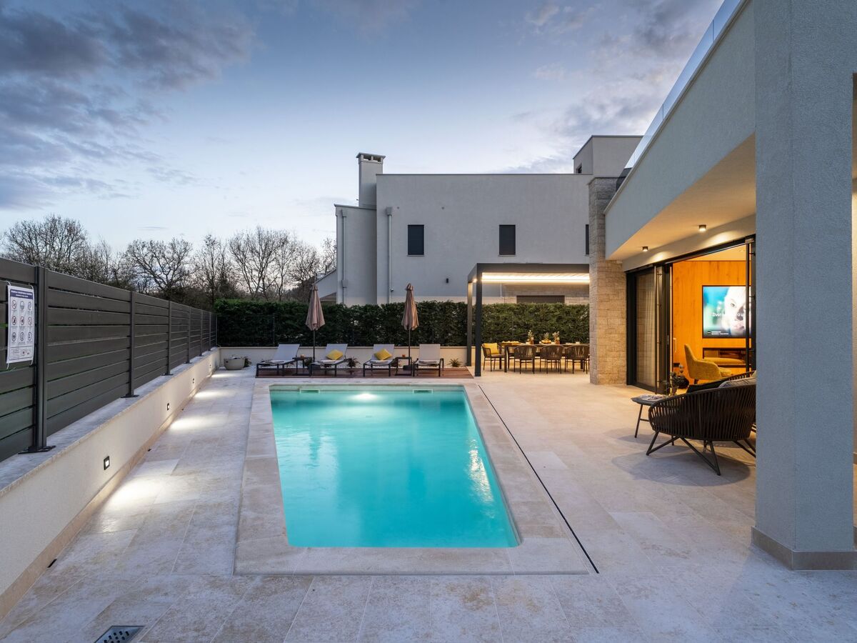 La Villa Pelin Exclusive est une maison de vacances moderne et luxueuse située en bordure du quartier résidentiel calme de Stranici, à seulement 4,5 km de la plage et à 10 minutes en voiture de Porec.