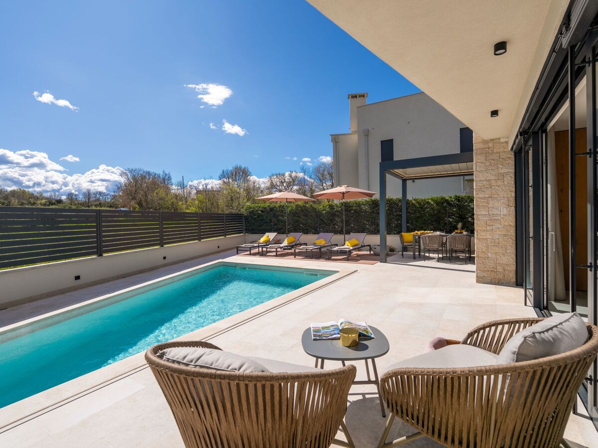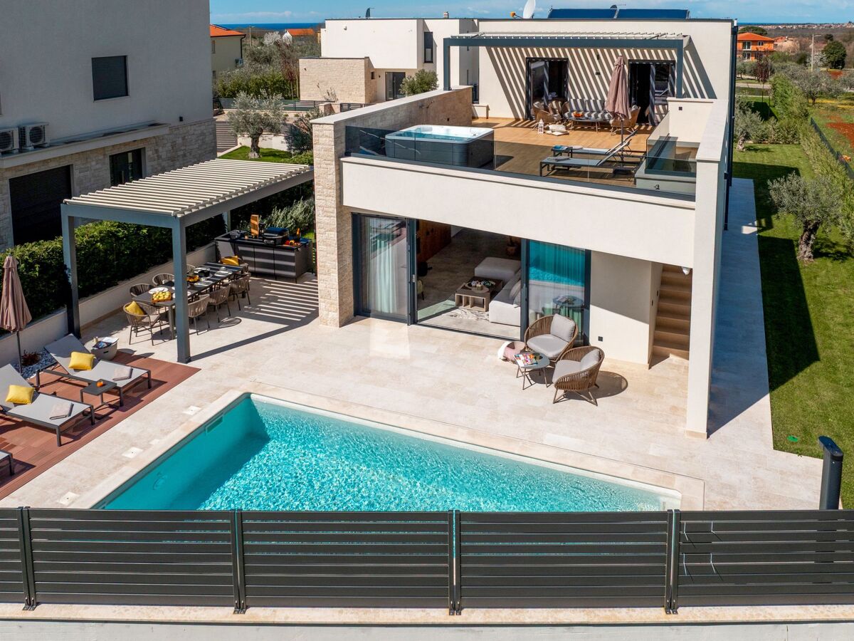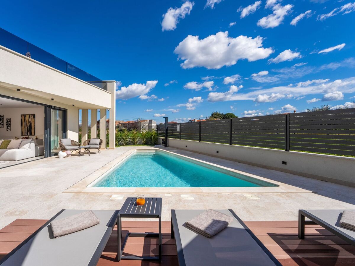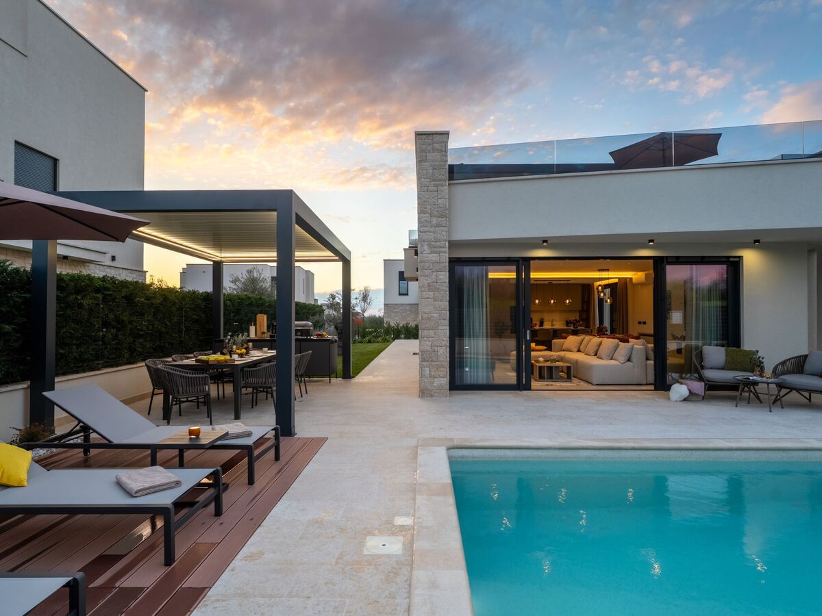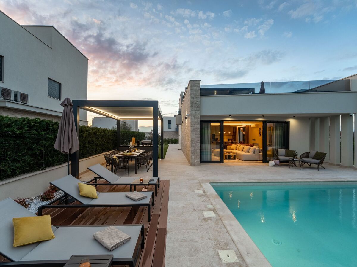 La Villa Pelin Exclusive est une maison de vacances moderne et luxueuse située en bordure du quartier résidentiel calme de Stranici, à seulement 4,5 km de la plage et à 10 minutes en voiture de Porec.