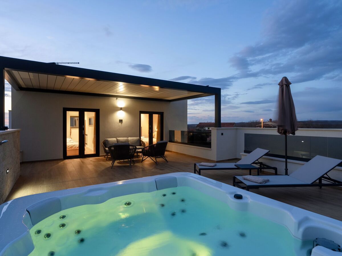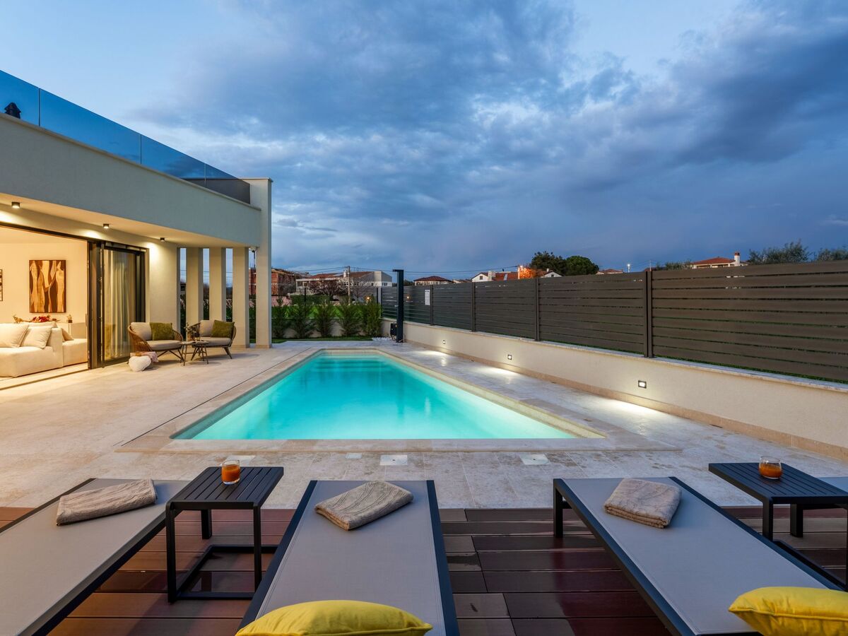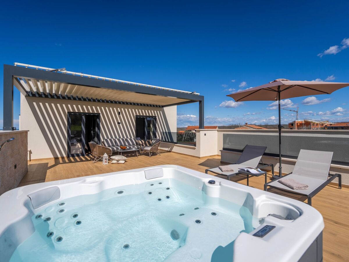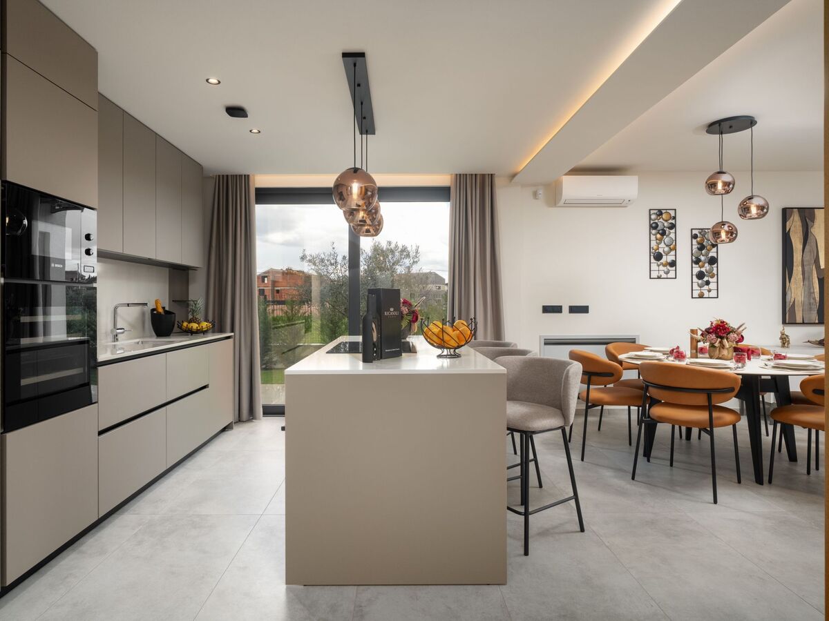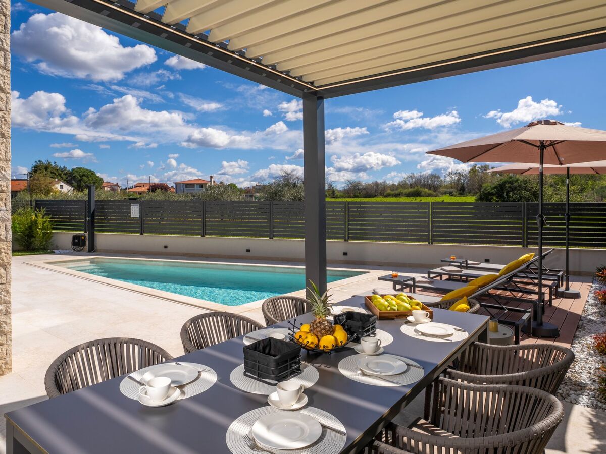 La Villa Pelin Exclusive est une maison de vacances moderne et luxueuse située en bordure du quartier résidentiel calme de Stranici, à seulement 4,5 km de la plage et à 10 minutes en voiture de Porec.