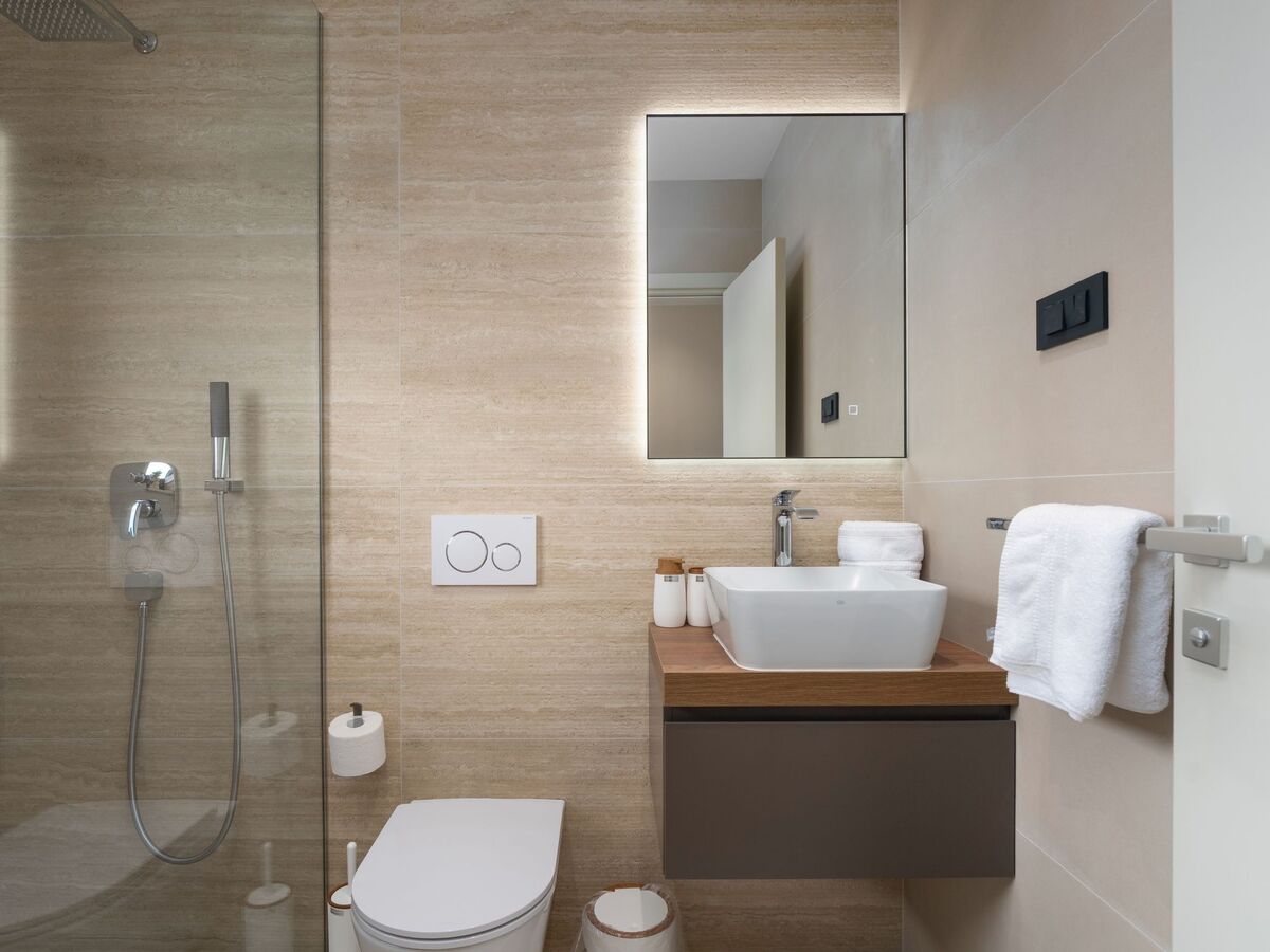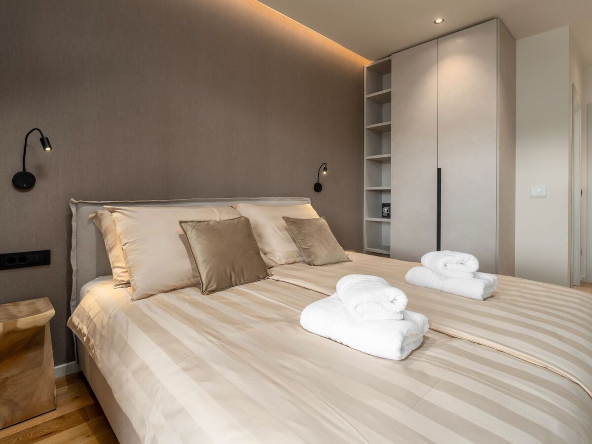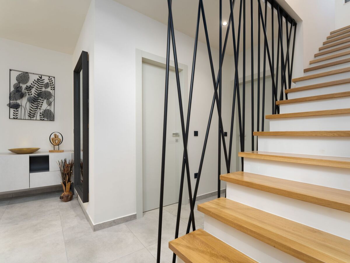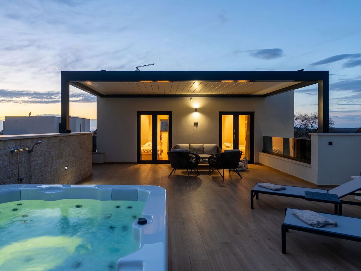 À l'étage supérieur se trouvent deux chambres à coucher, chacune avec sa propre salle de bain et un accès à une terrasse spacieuse avec jacuzzi, également accessible par un escalier extérieur depuis l'espace piscine.
