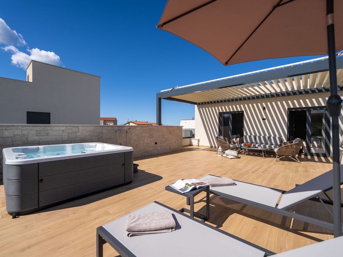 La particularité de cette magnifique villa est une terrasse sur le toit de 50m2 sur laquelle se trouvent un jacuzzi, des meubles de salon, une douche extérieure et des chaises longues.