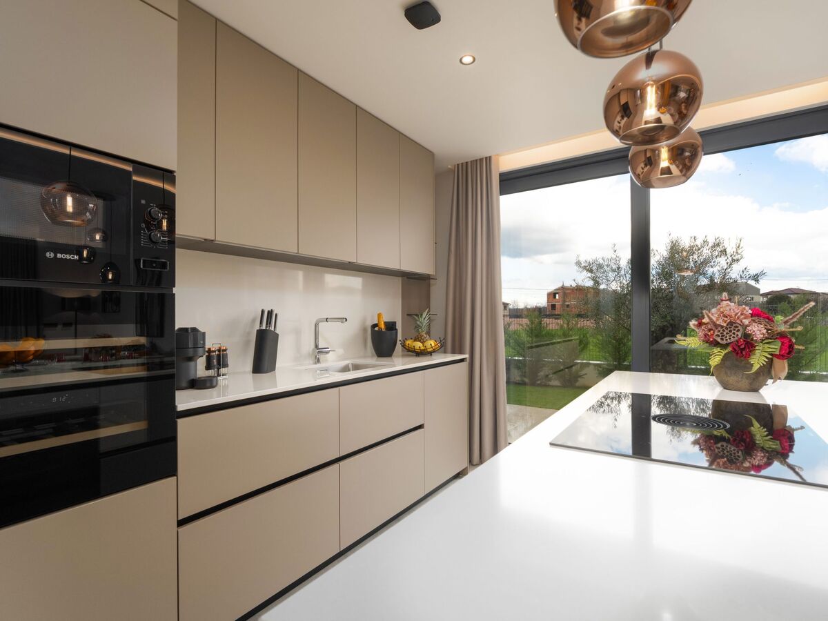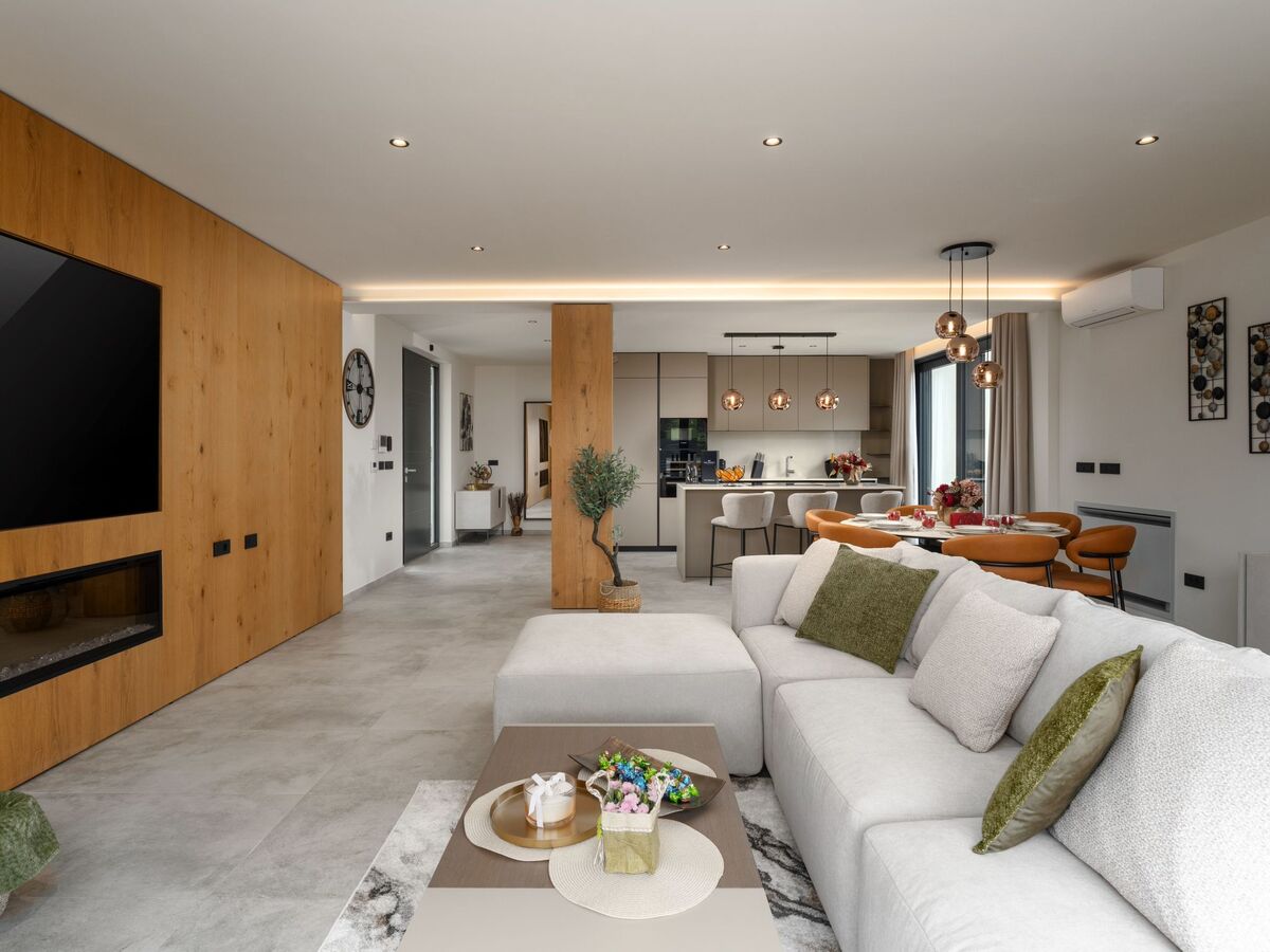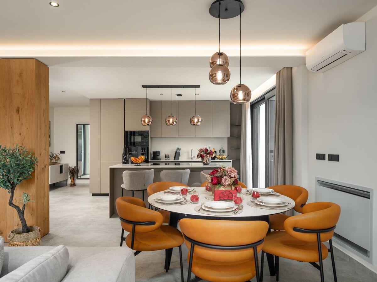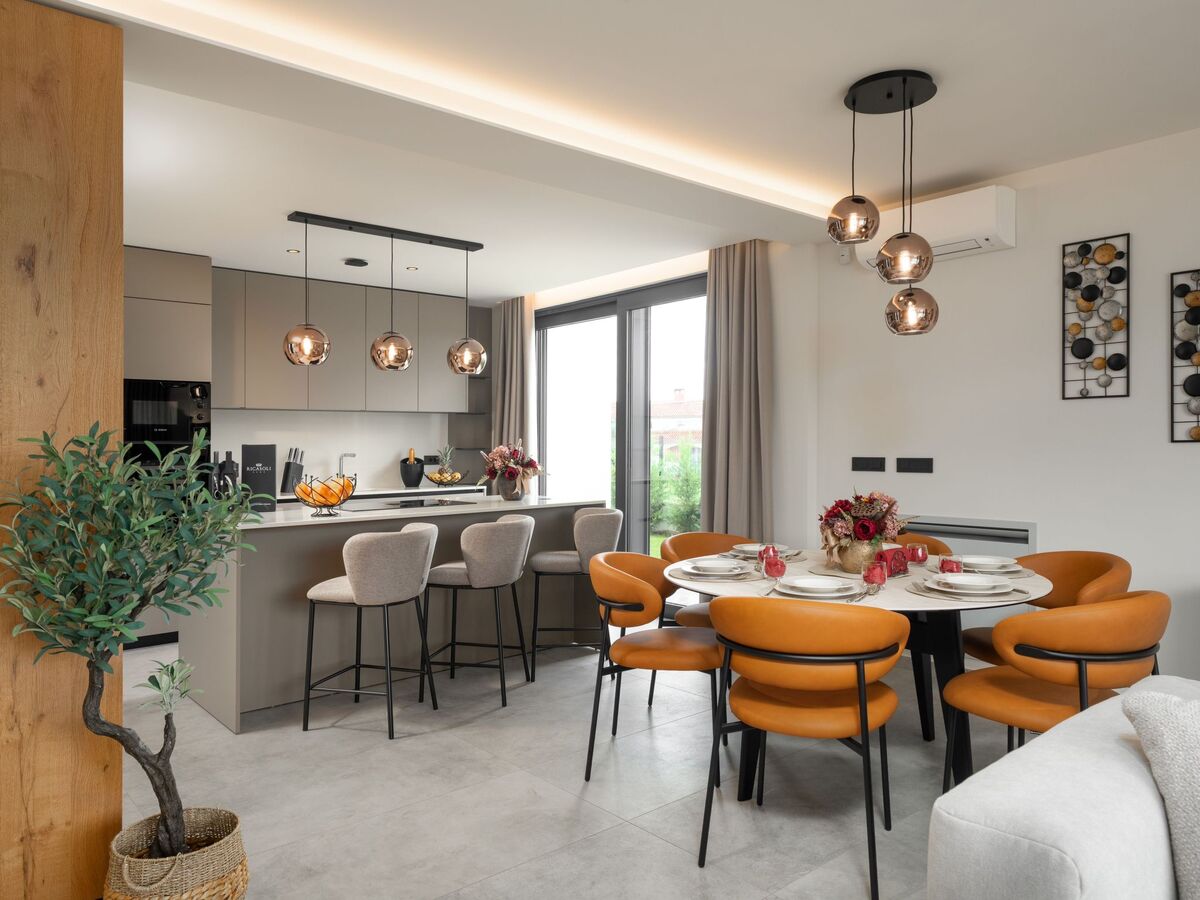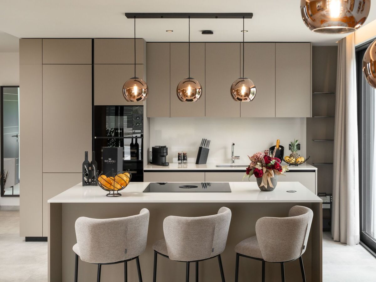 Au rez-de-chaussée, il y a un salon luxueusement aménagé avec beaucoup de lumière du jour grâce aux grandes parois vitrées, un coin repas et une cuisine entièrement équipée.