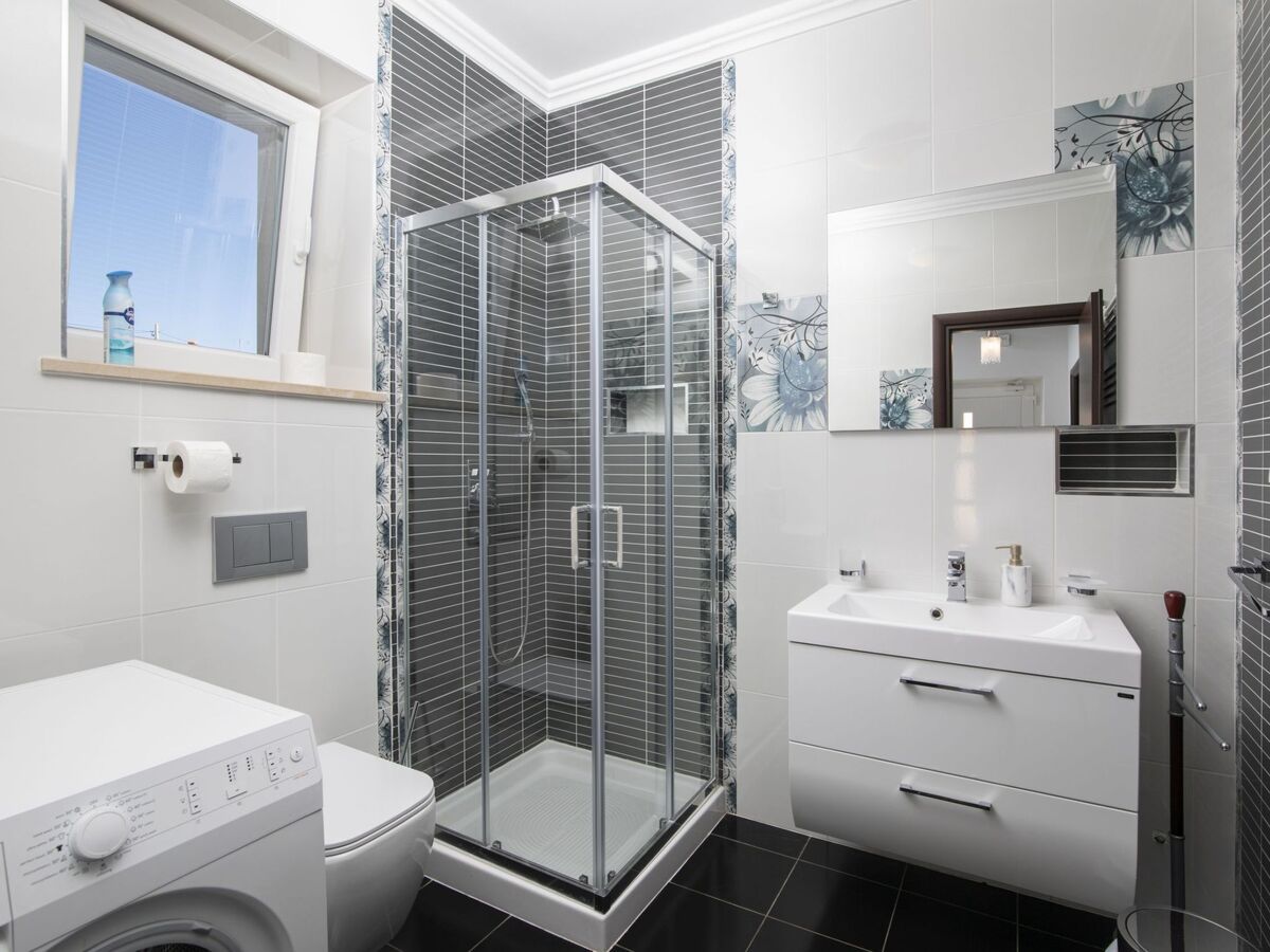 Inside, the ground floor hosts an open-plan living space with a fully equipped kitchen, dining area, and a bathroom with a shower and washing machine.