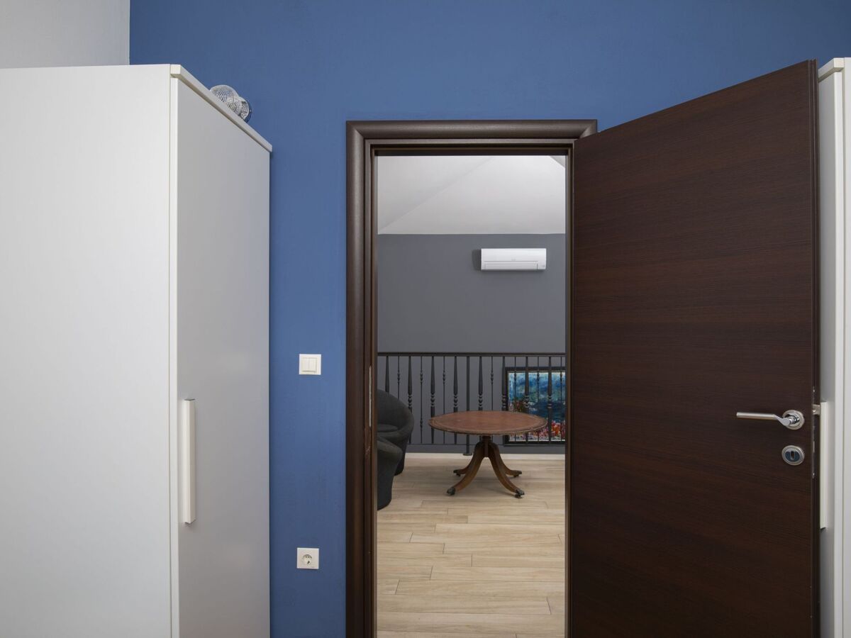 The villa is equipped with three air conditioning units: one in the poolside bedroom, one in the ground-floor living room, and one on the first floor.