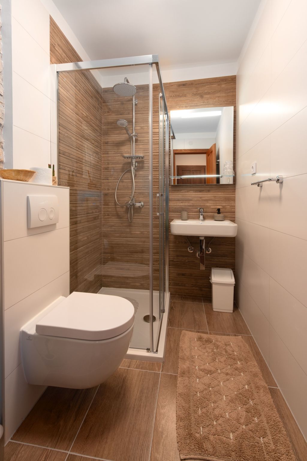 The ensuite bathrooms are equipped with a large shower cabin, wash basin, wall mirror, hairdryer and a toilet.