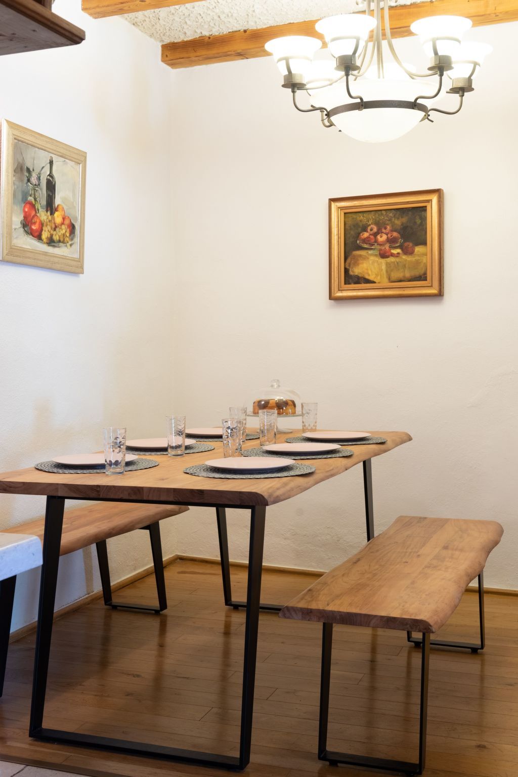 On the other side of the room is a solid wood dining table with a matching bench and chairs.