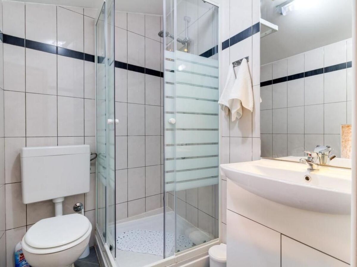 A charming wooden staircase leads you to the first floor, where you find two bedrooms - one with a double bed and an en-suite bathroom with a shower, and another with two single beds and its own bathroom with a shower.
