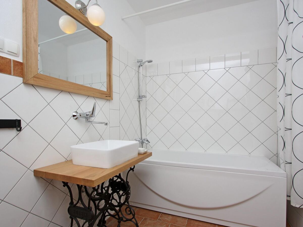 The centrepiece of the accommodation is the comfortable living room with a fireplace and sofas, directly adjoining the spacious dining area with a kitchen unit, equipped with a dishwasher, oven and fridge.
