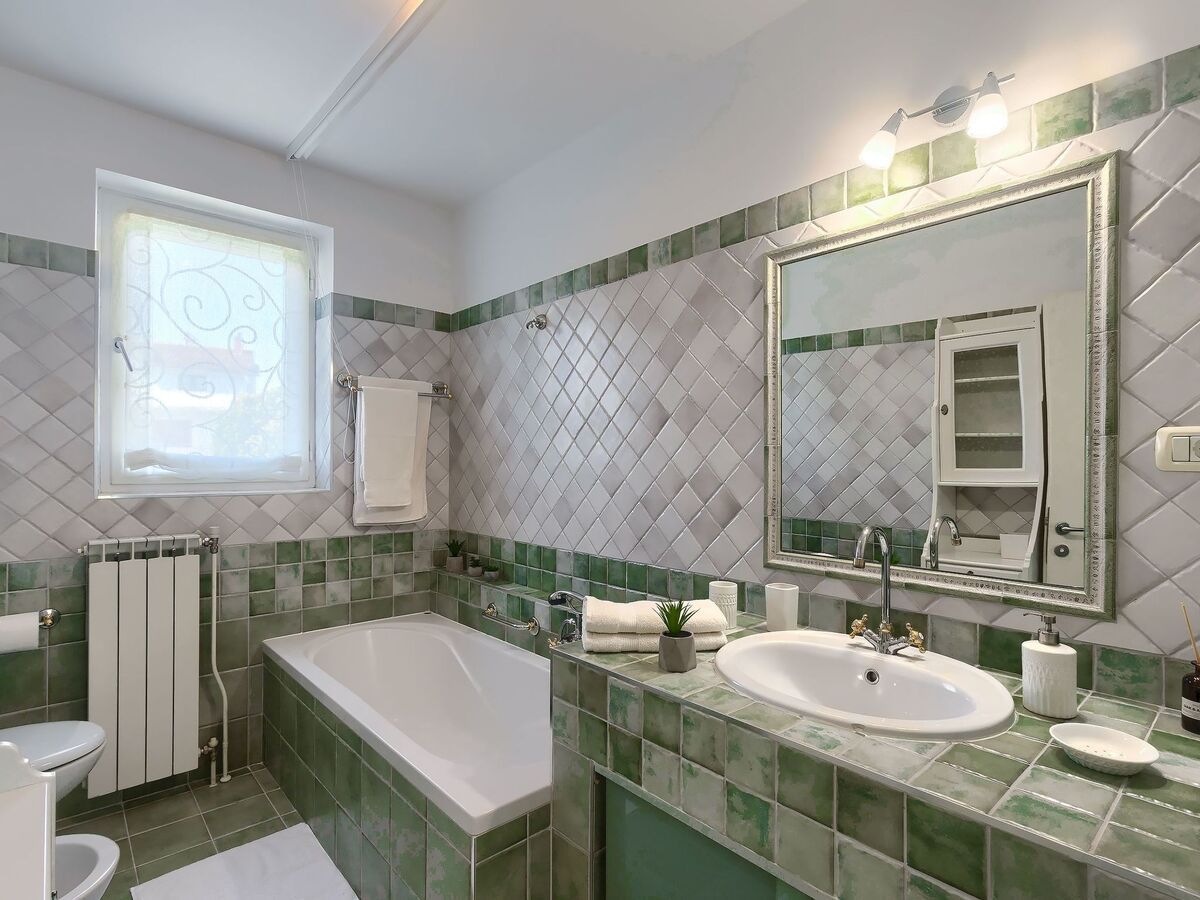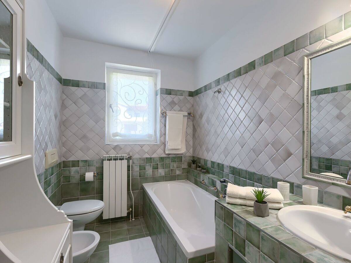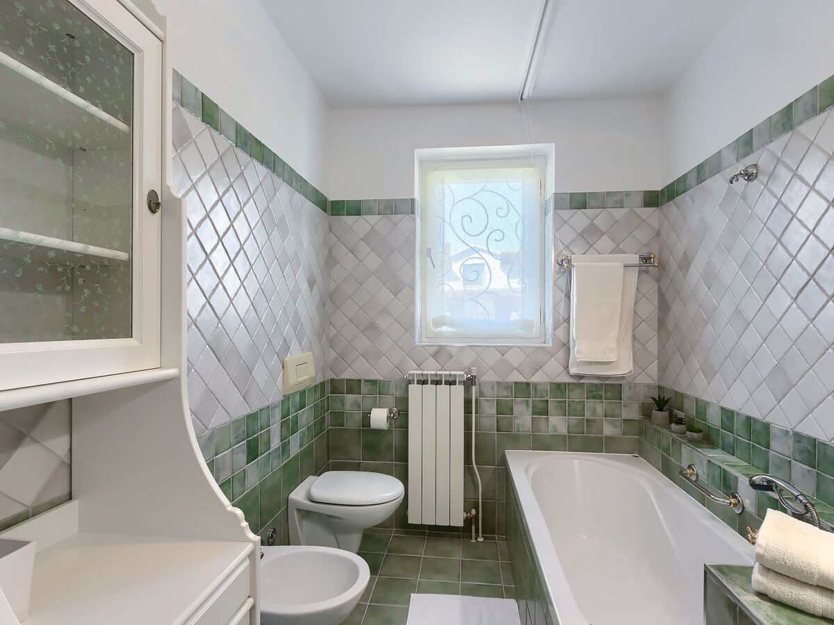 One large bathroom ( bathtub, bidet) and one toilet ( washing machine).