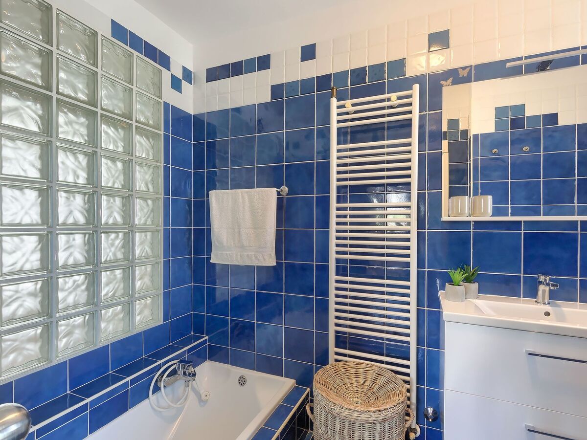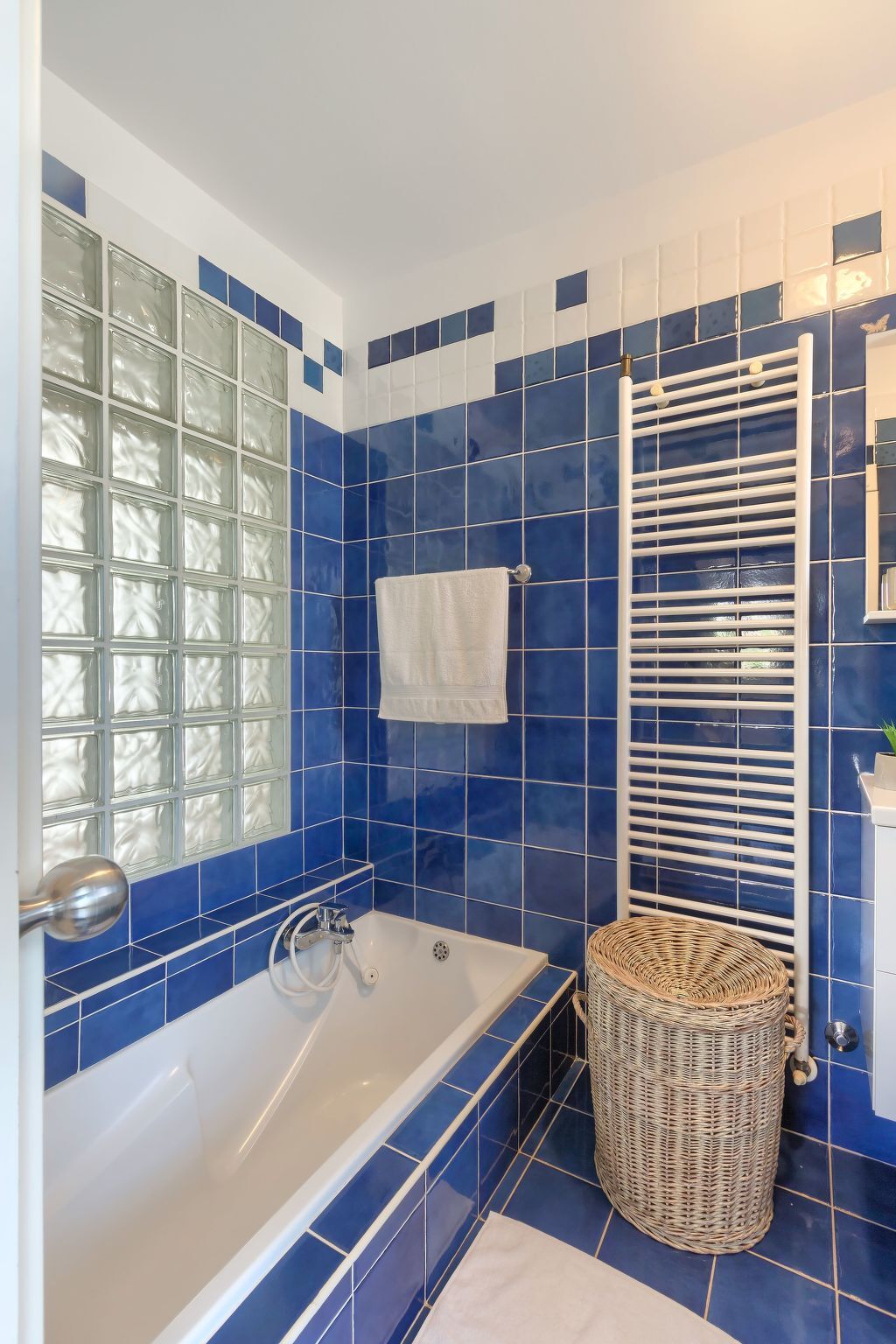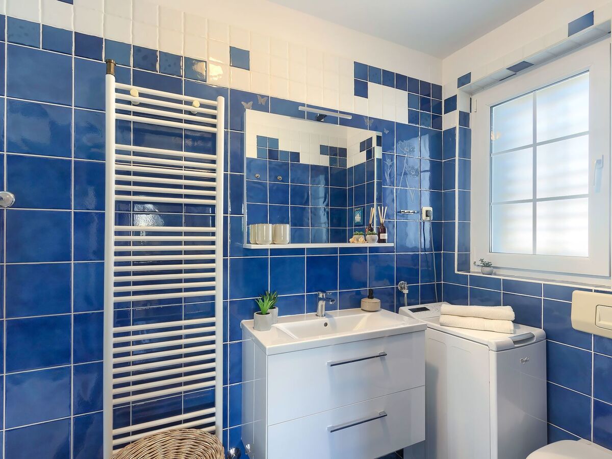 One large bathroom ( bathtub, bidet) and one toilet ( washing machine).