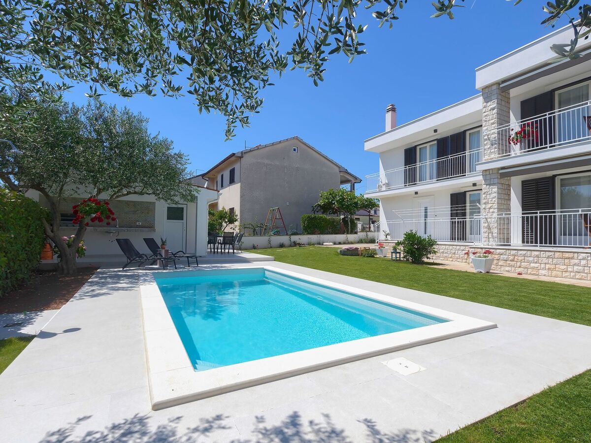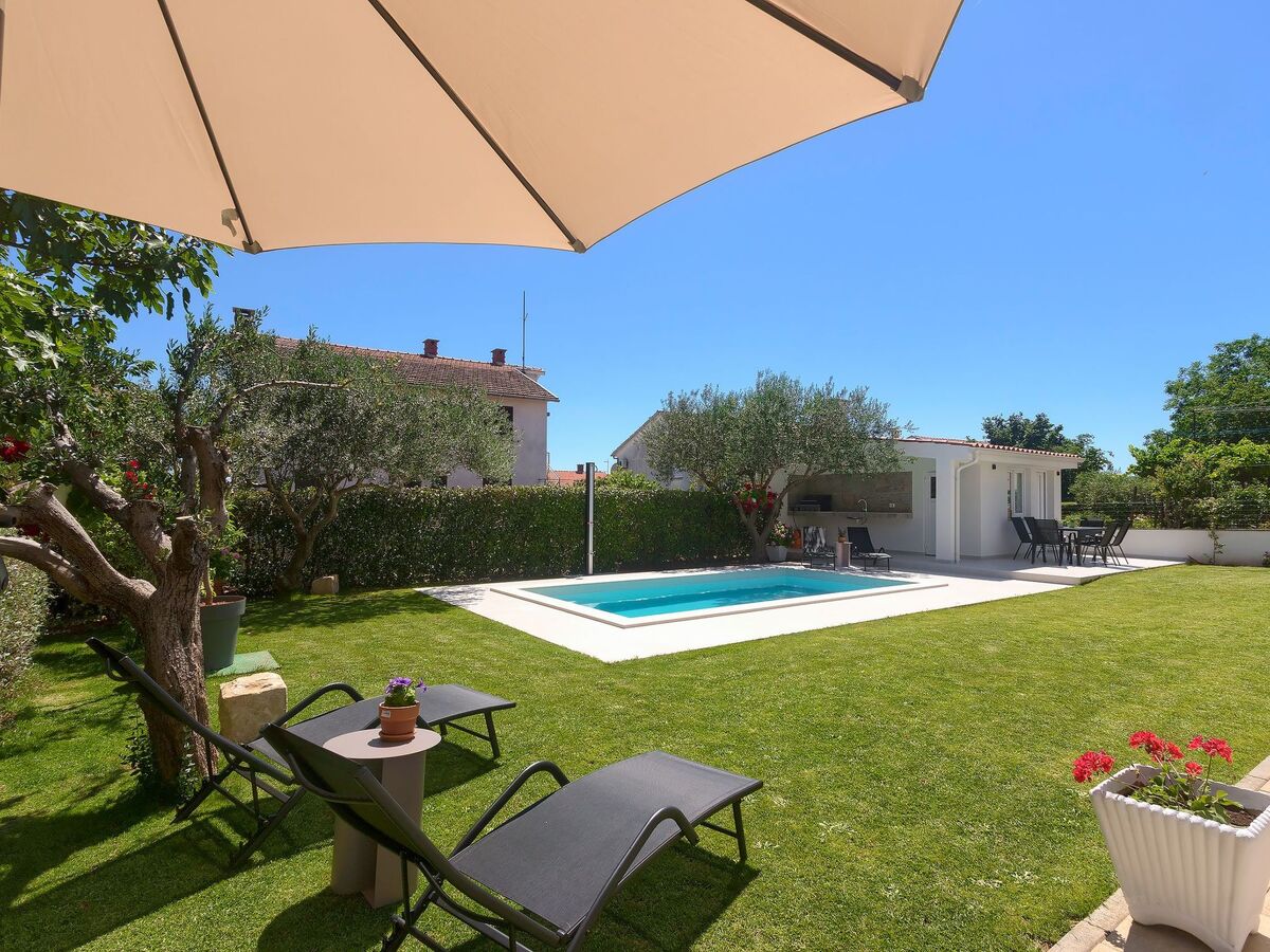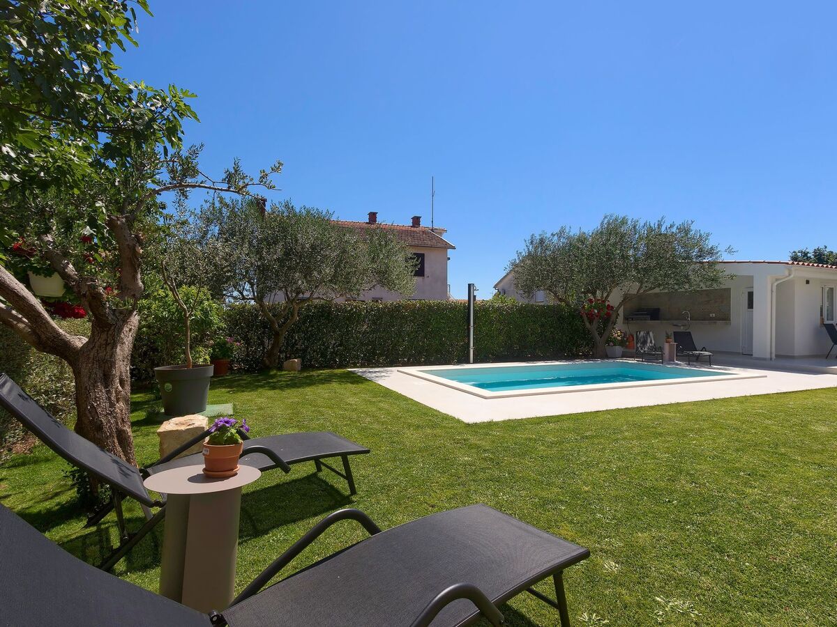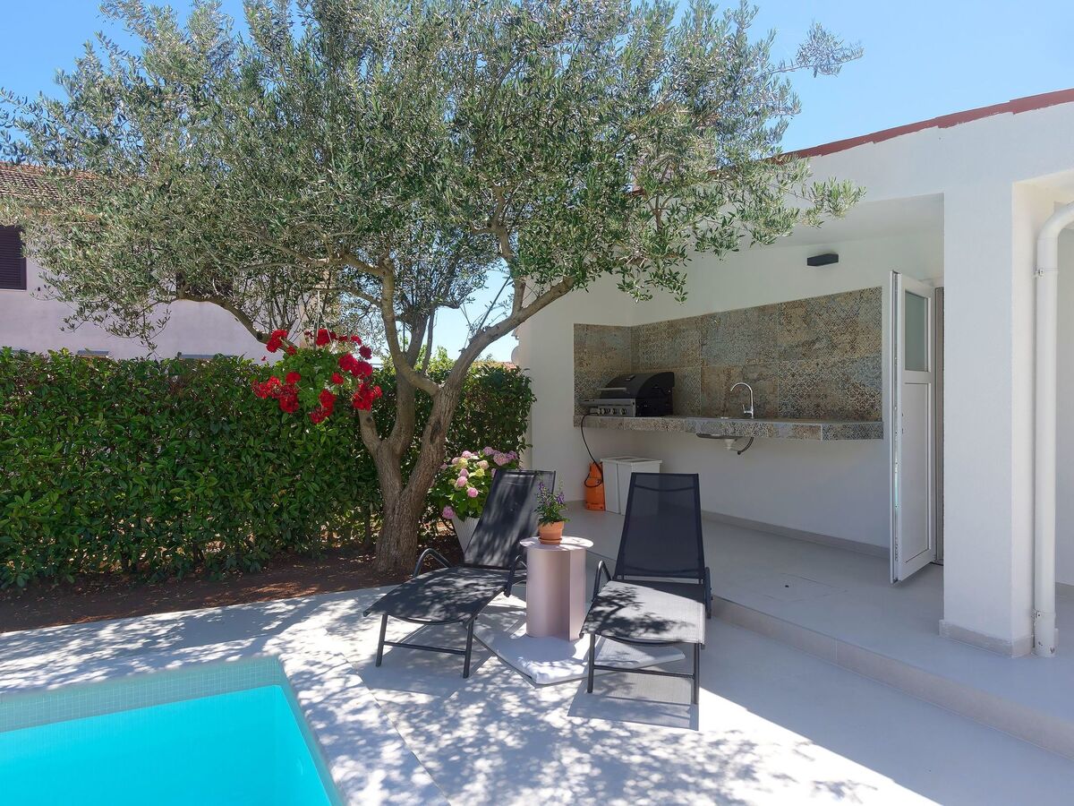 On the other side of the house, there is a beautiful fenced green garden with a private pool (6 deck chairs, 2 parasols) and an outdoor kitchen (outdoor grill, sink, gas stove, dining table).