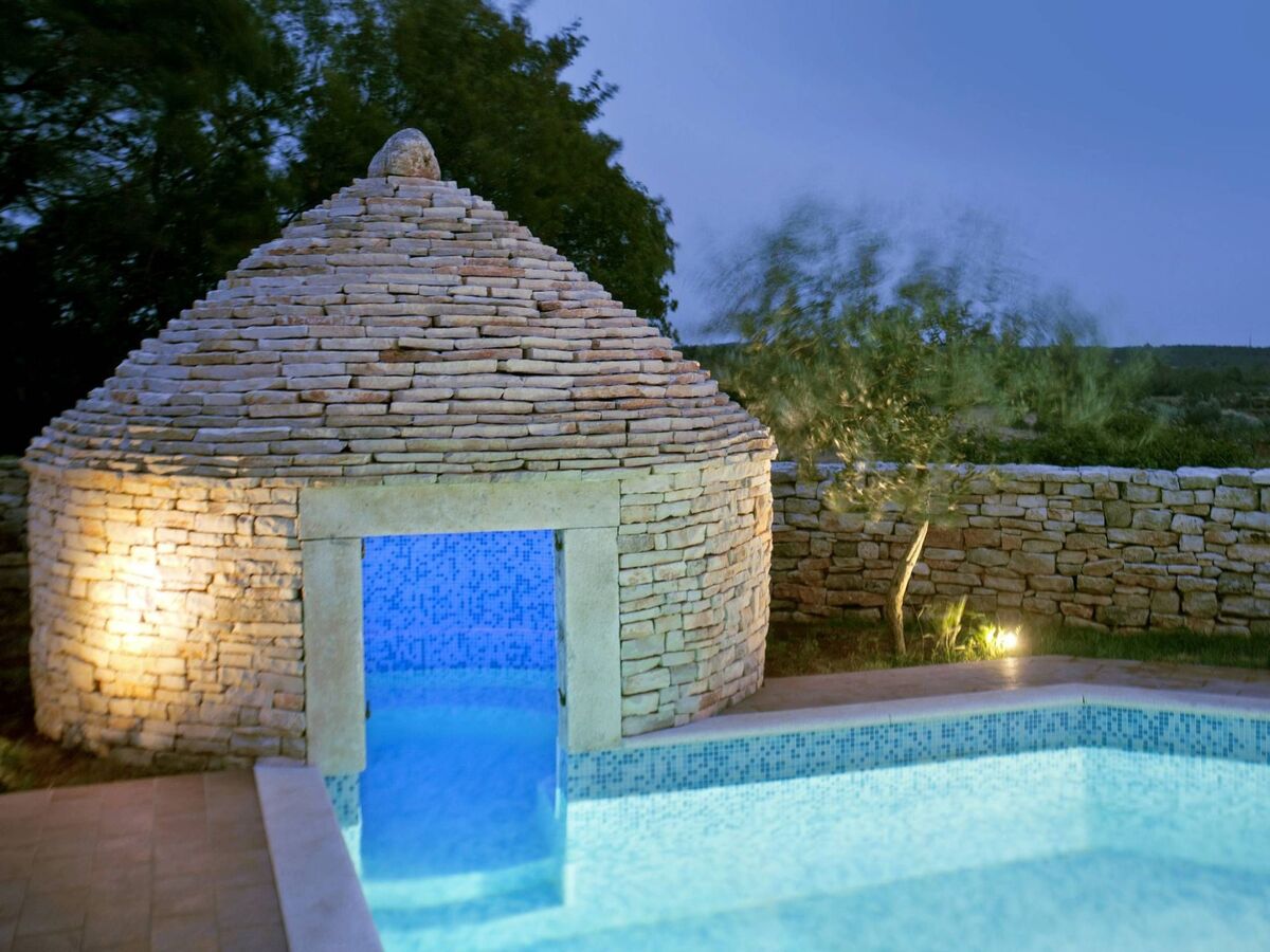 A traditional Istrian kažun stone hut adds rustic charm to the property, while the covered terrace and charcoal barbecue create the perfect setting for outdoor meals.