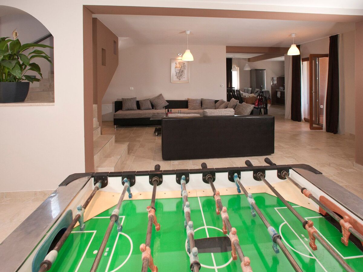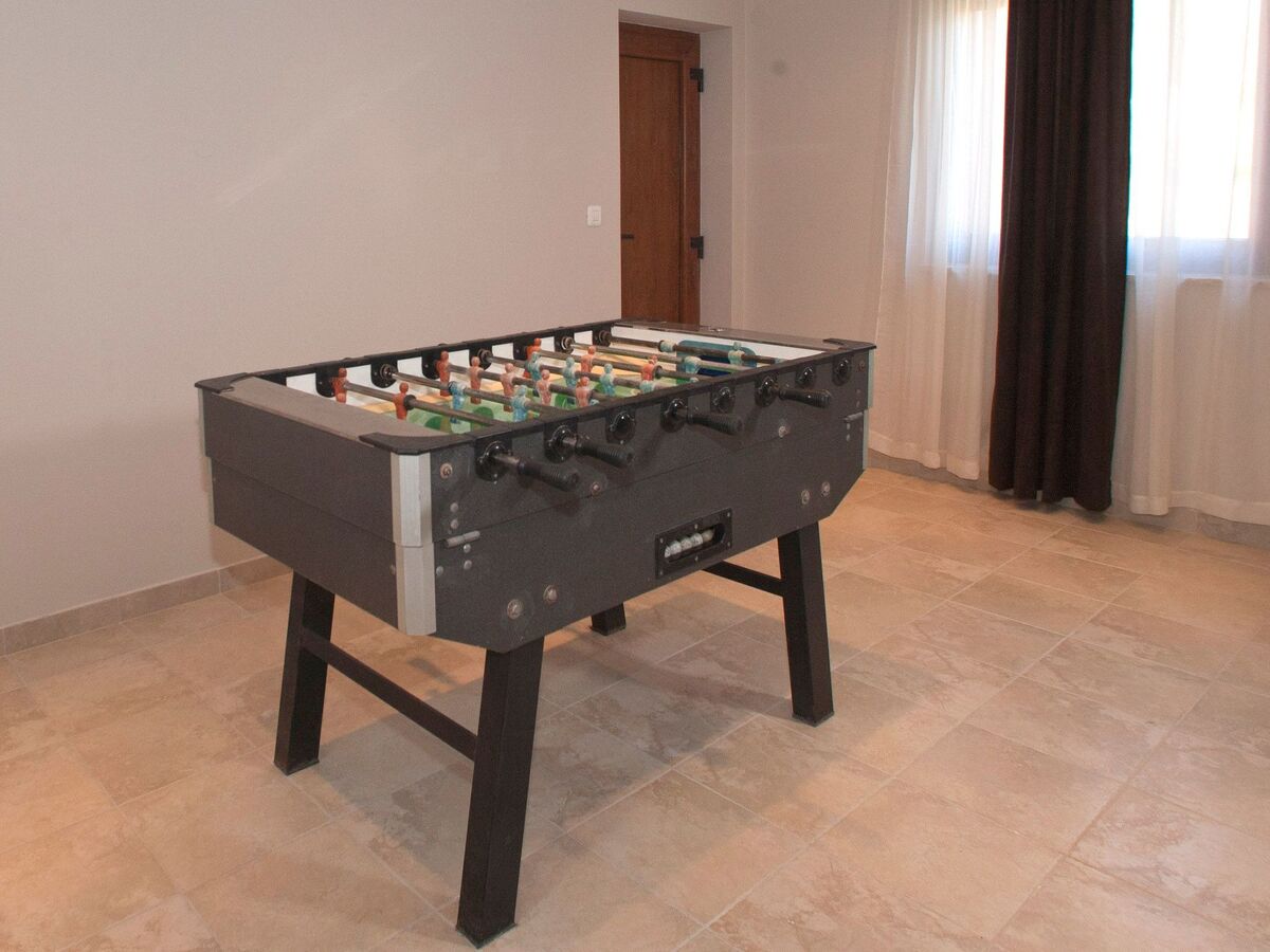 It features 5 bedrooms, each with its own bathroom, kitchen with living room and football table.