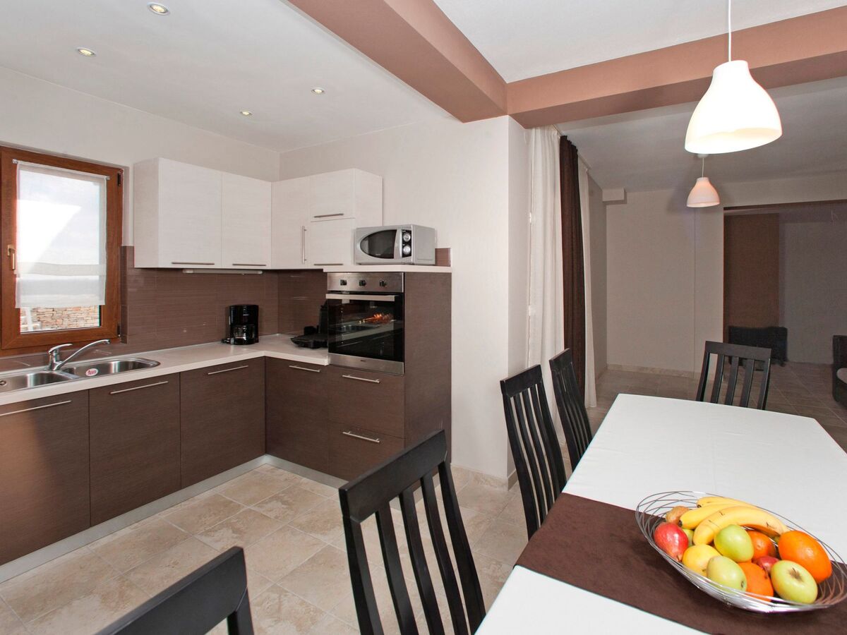 -kitchen and dining table; kitchen equipment: 4 ring stove, freezer, dishwasher, fridge, microwave, oven, coffee machine