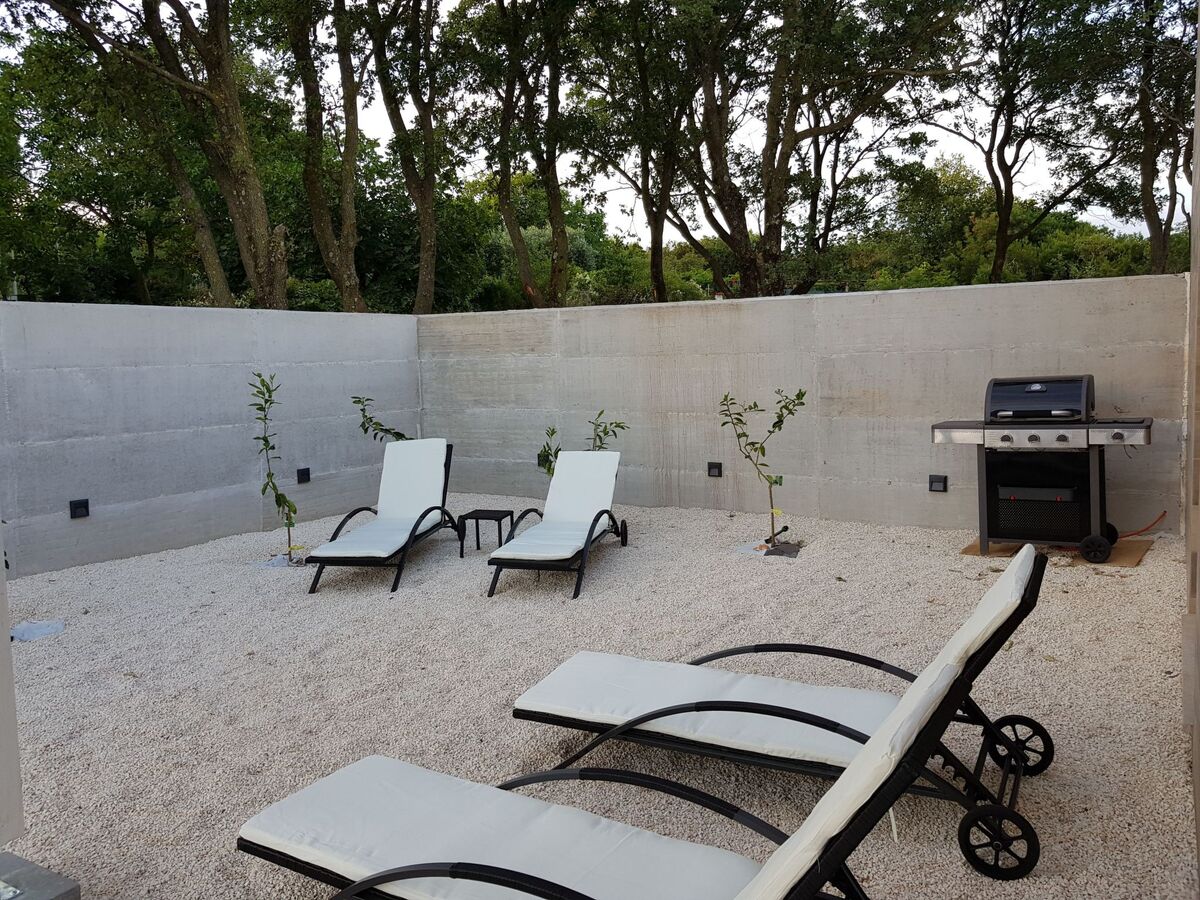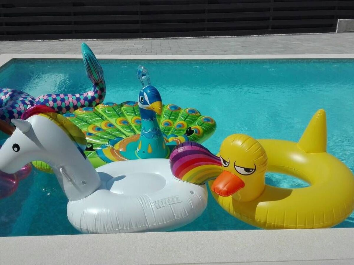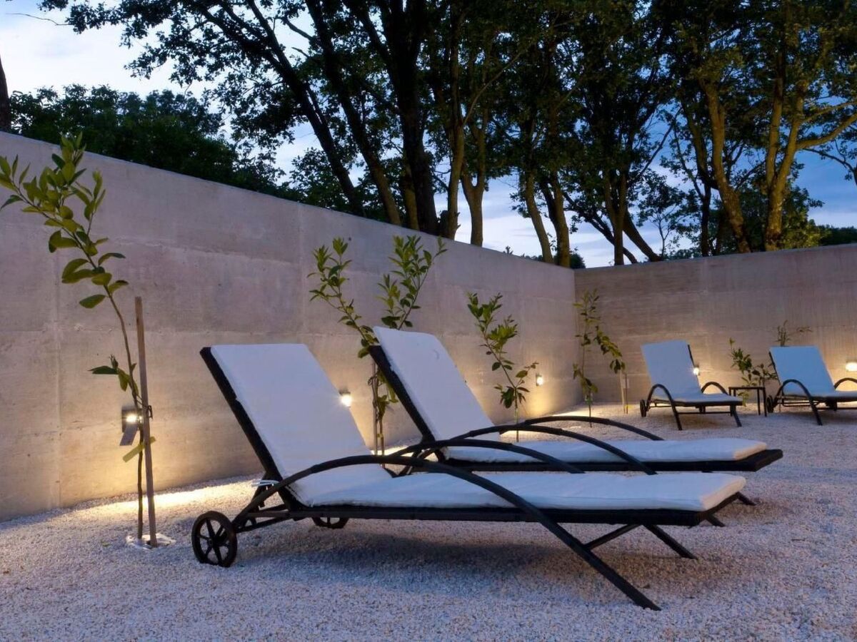 De là, vous pouvez profiter de la vue sur la piscine et la terrasse avec une grande table, un barbecue à gaz et des chaises longues.