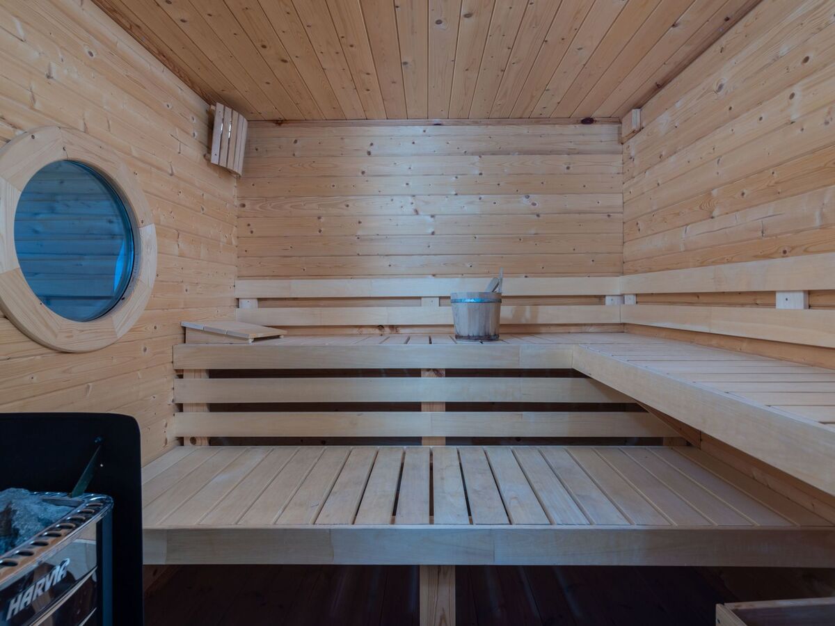 Le sous-sol offre, outre un WC pour les invités, un espace bien-être avec un coin fitness, un sauna finlandais, une douche, un jacuzzi et une télévision.