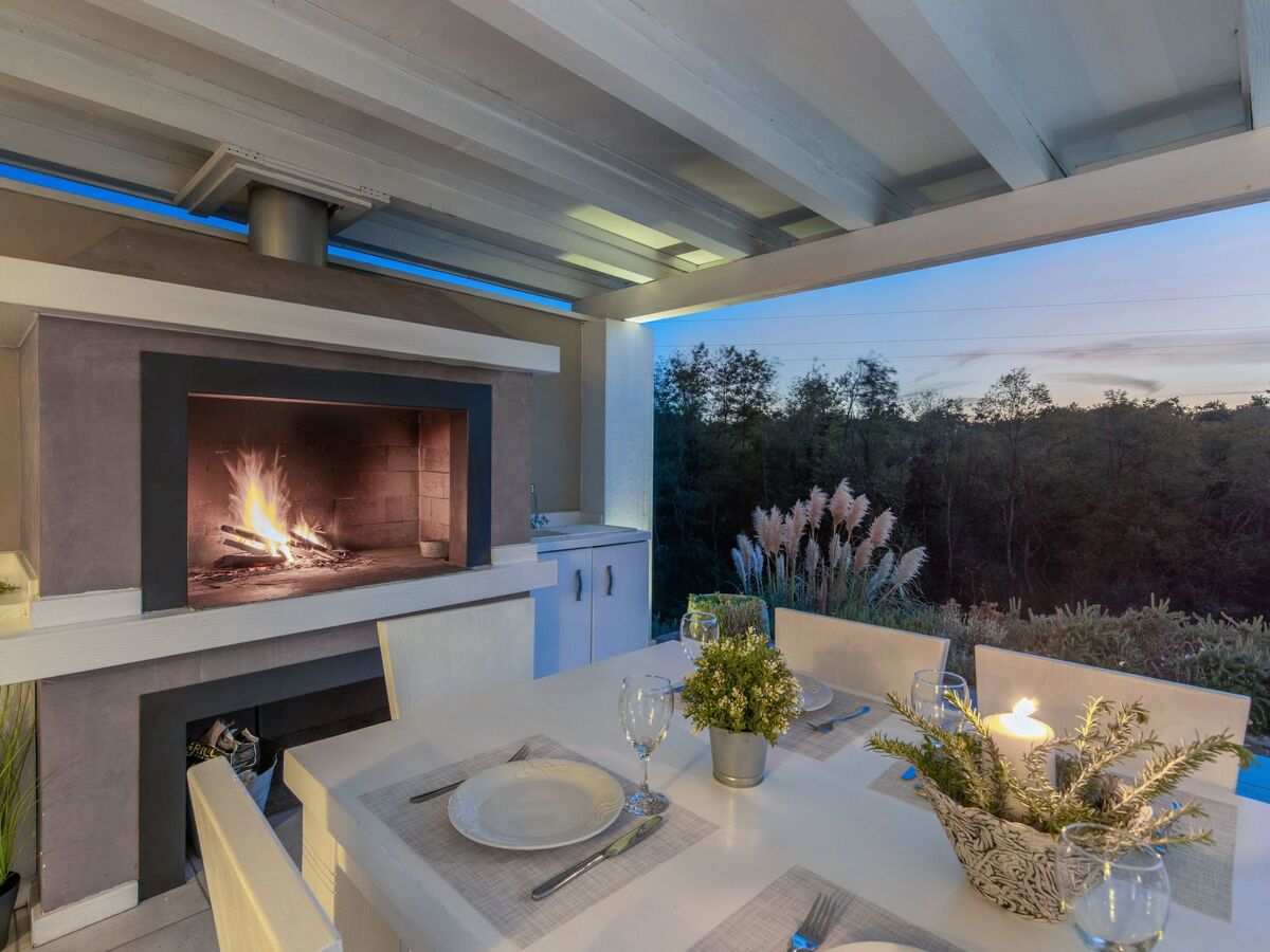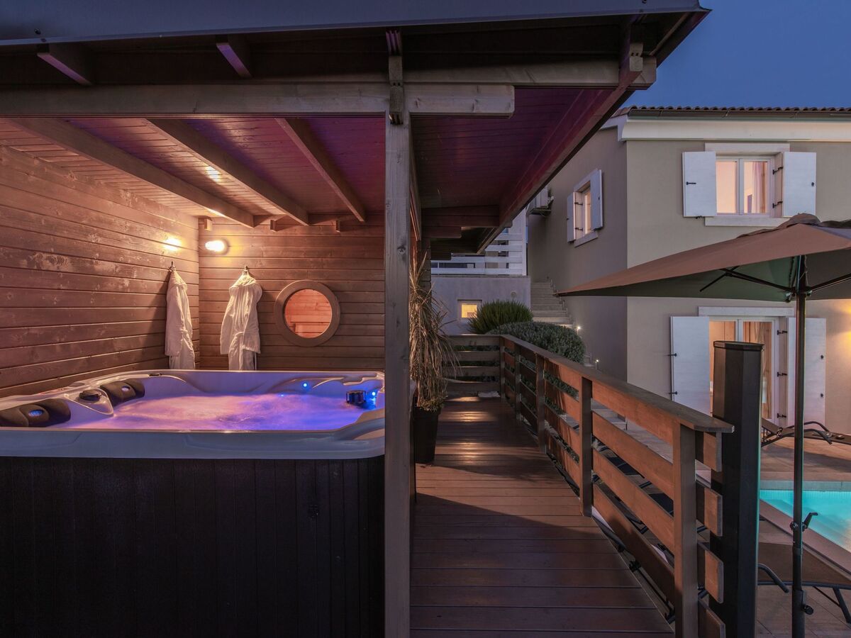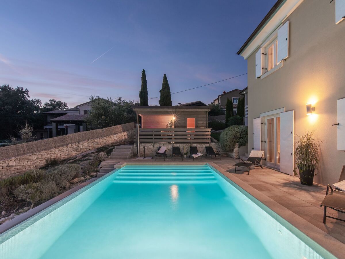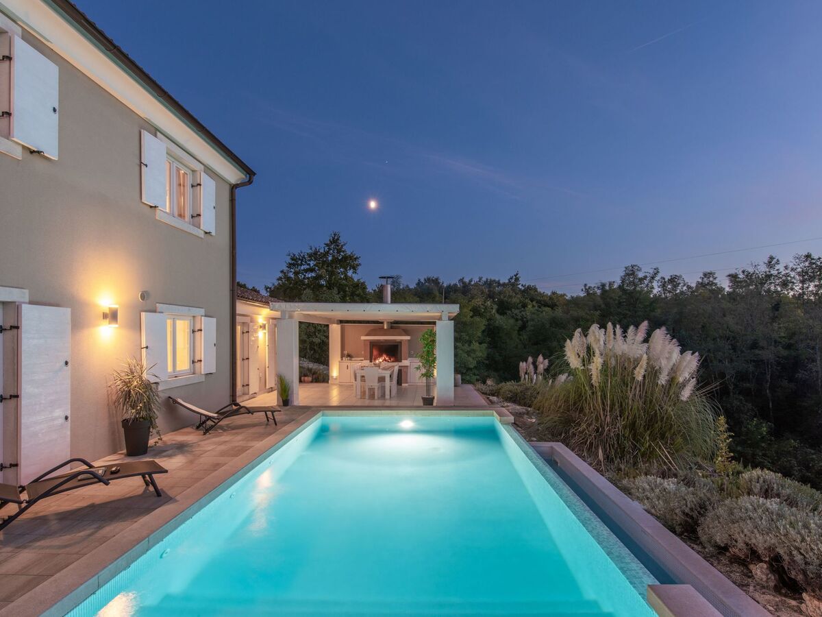 La cuisine extérieure et le barbecue, l'atmosphère éclairée de la piscine ainsi que les lanternes estivales créent un sentiment de vacances parfait.