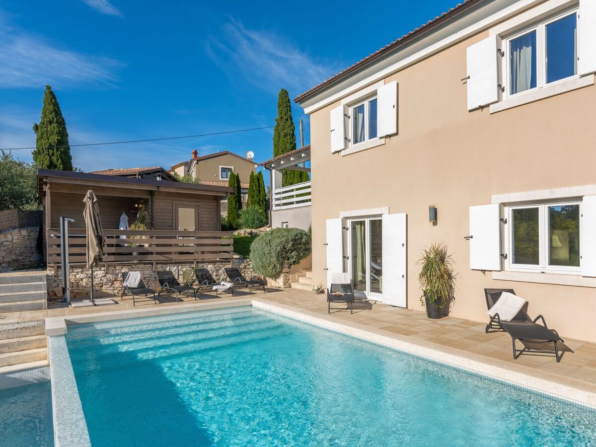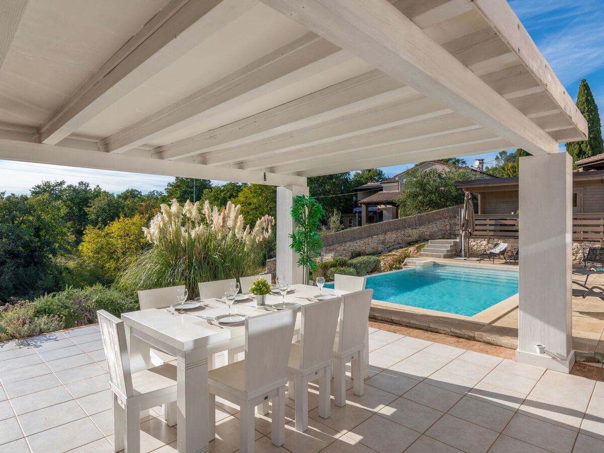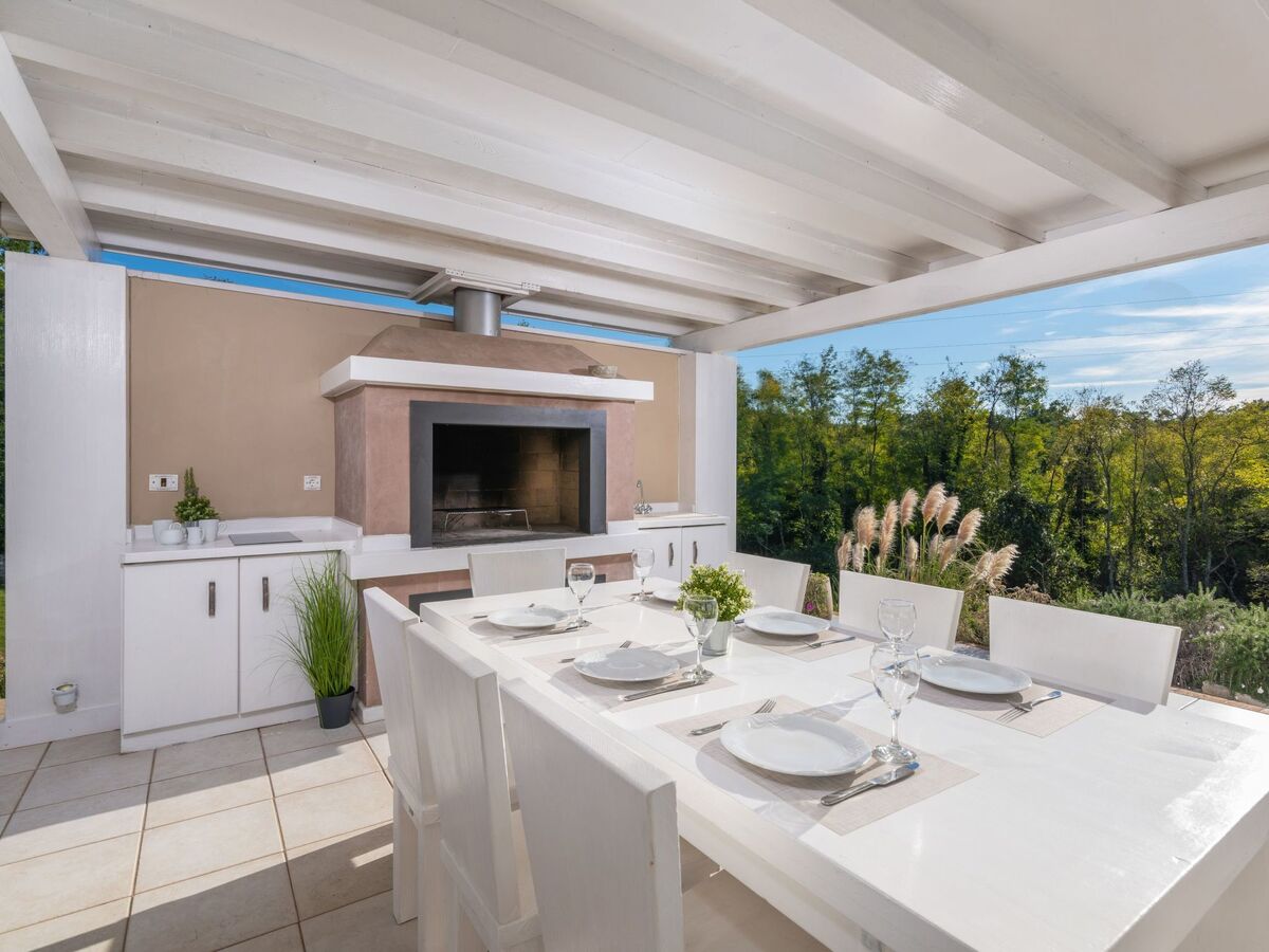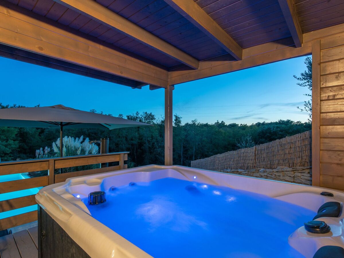 La cuisine extérieure et le barbecue, l'atmosphère éclairée de la piscine ainsi que les lanternes estivales créent un sentiment de vacances parfait.