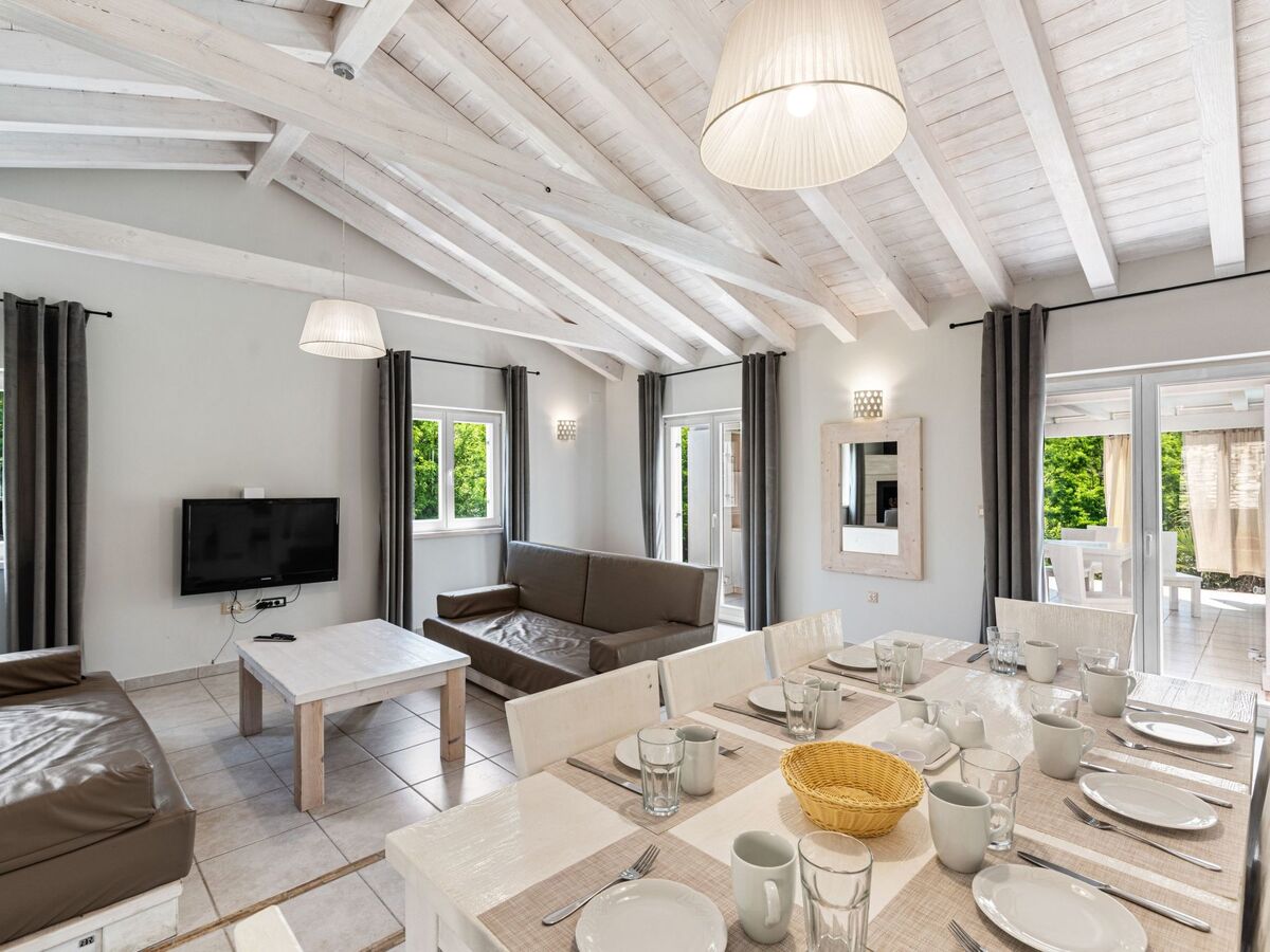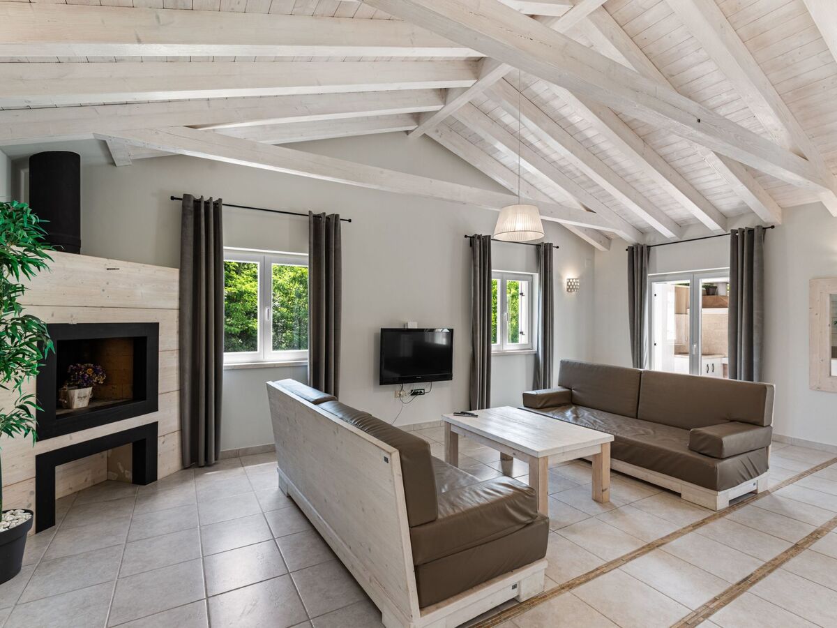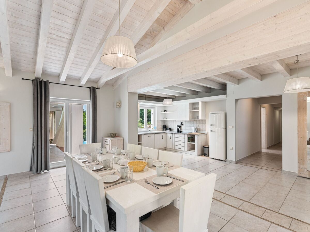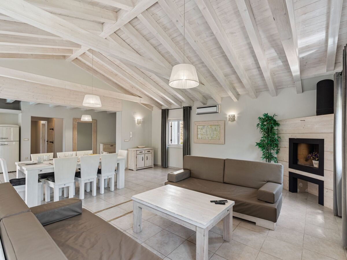 À l'intérieur de la Villa Monet se trouve un espace de vie ouvert avec une grande table à manger, un coin canapé confortable, une télévision à écran plat et un joli poêle à bois, idéal pour passer des soirées agréables.