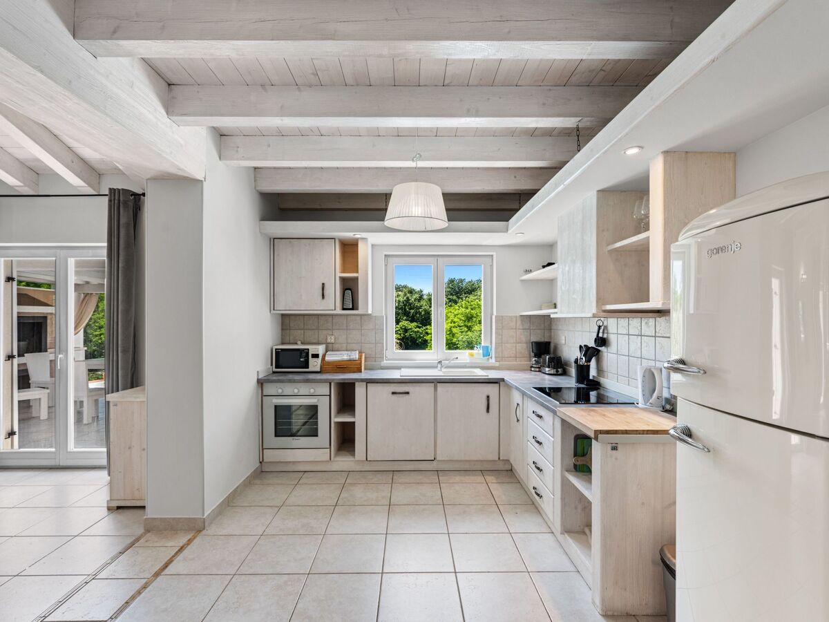 La cuisine en bois est faite sur mesure et parfaitement équipée - du four à micro-ondes au lave-vaisselle, en passant par la plaque de cuisson en vitrocéramique et le réfrigérateur confort au look rétro.