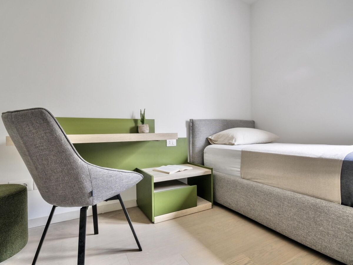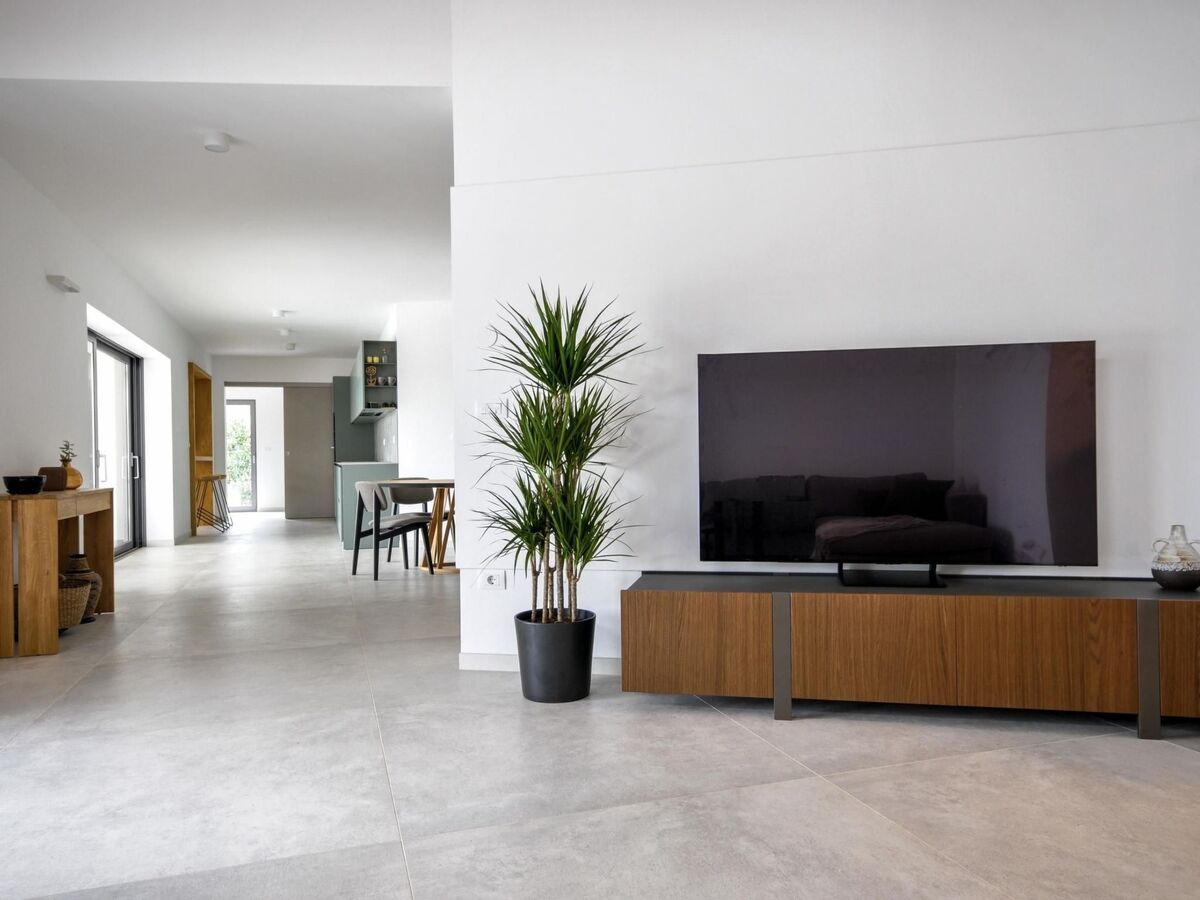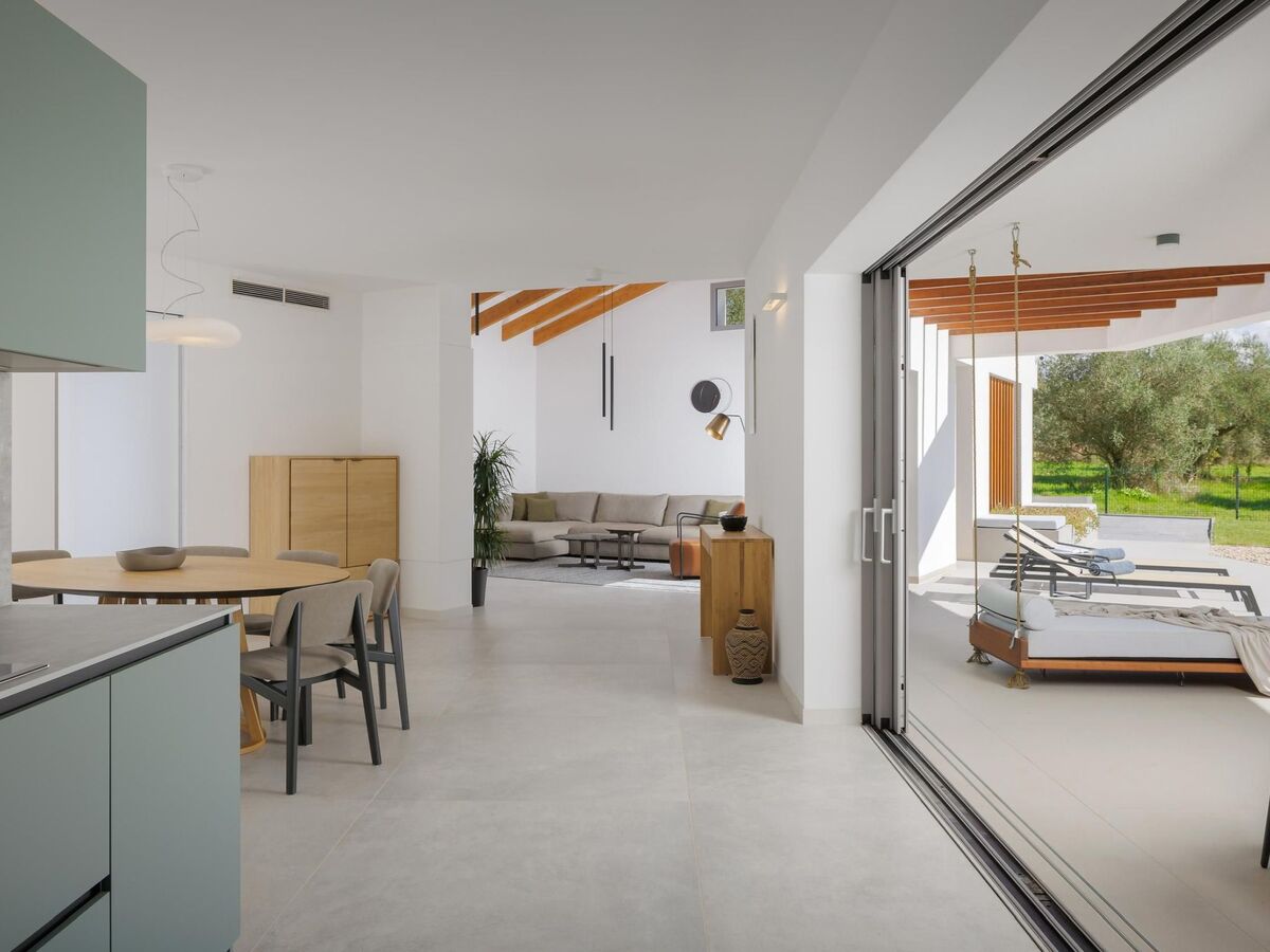 Elle offre un accès à un balcon couvert donnant sur la piscine et le jardin d'oliviers.