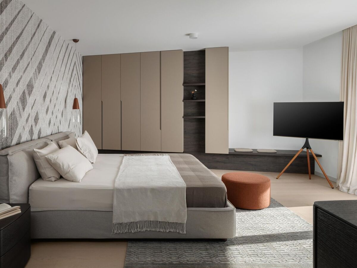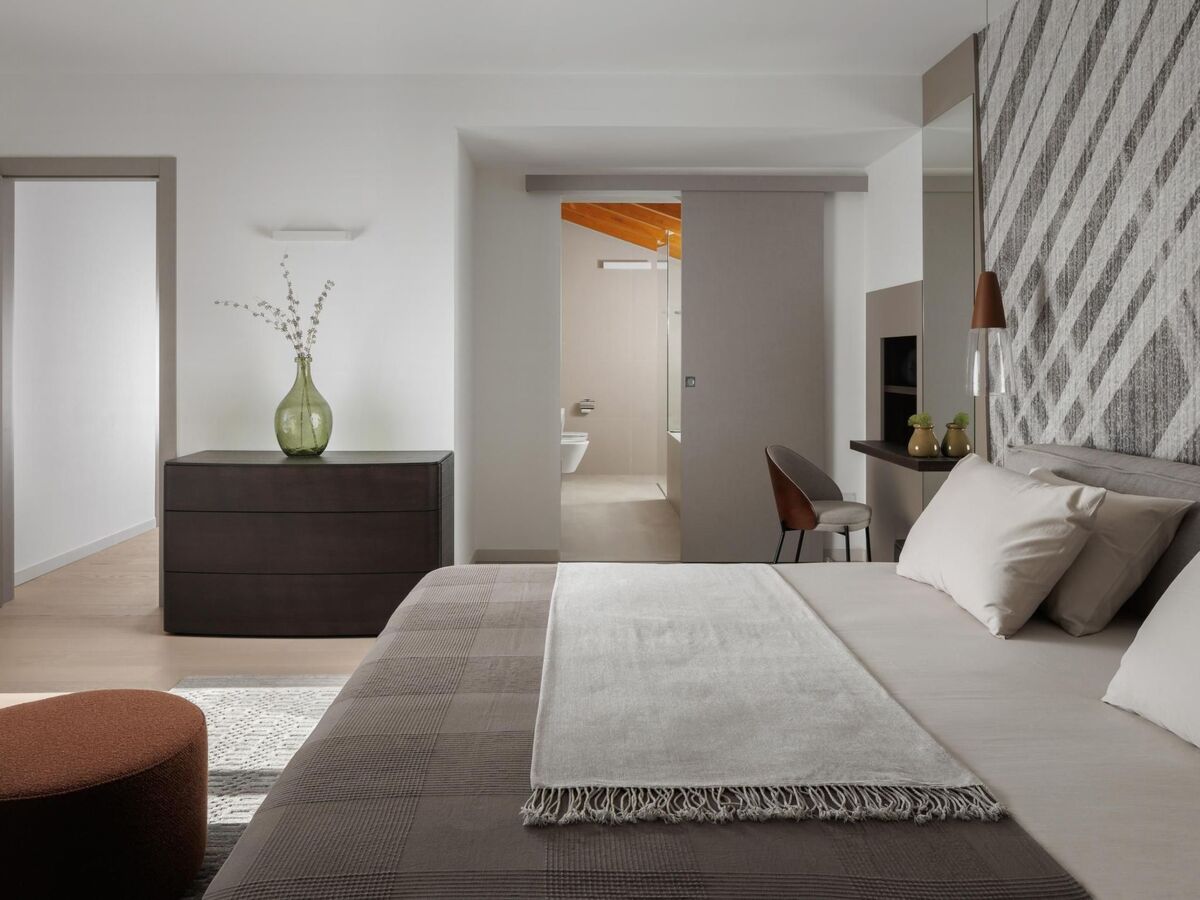 La chambre principale, située au premier étage, dispose d'un lit double king-size et d'une luxueuse salle de bains attenante avec baignoire et douche.