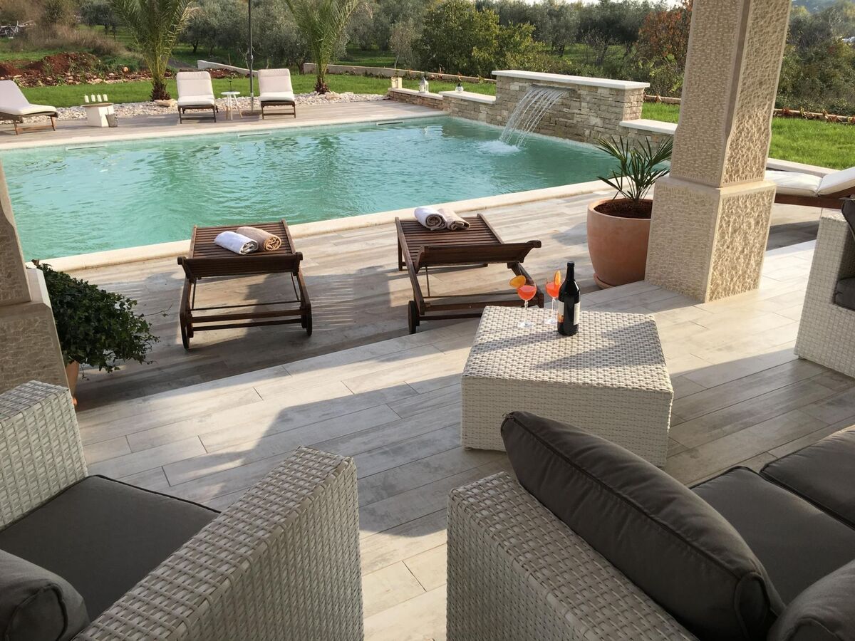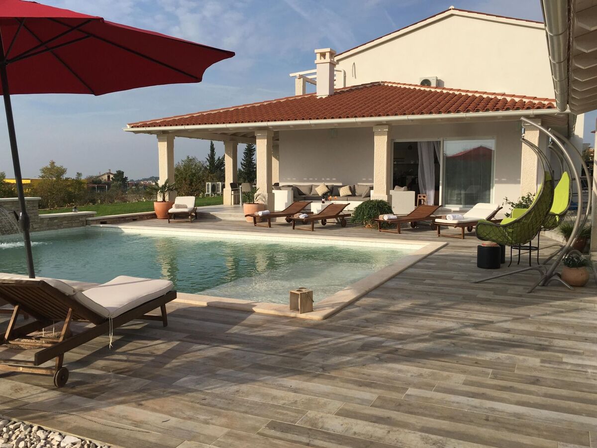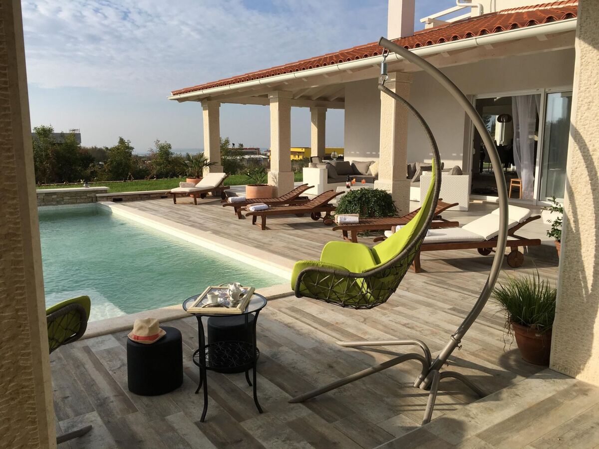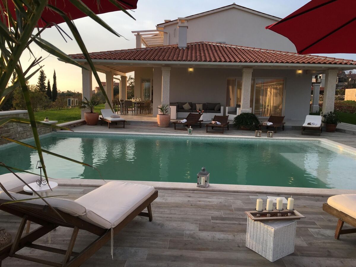 This fabulous white villa lies in Vodnjan, on the southern tip of the Istrian peninsula, near Pula, affording a view of the sea and the Brijuni Islands.