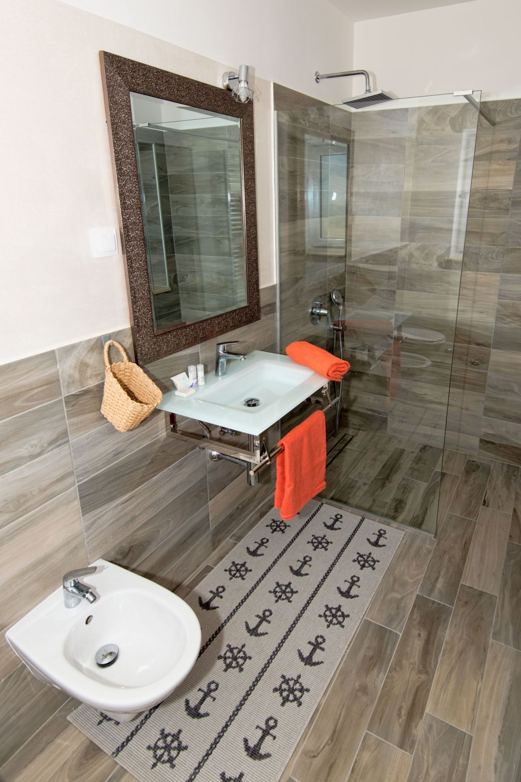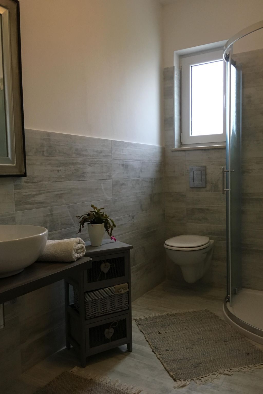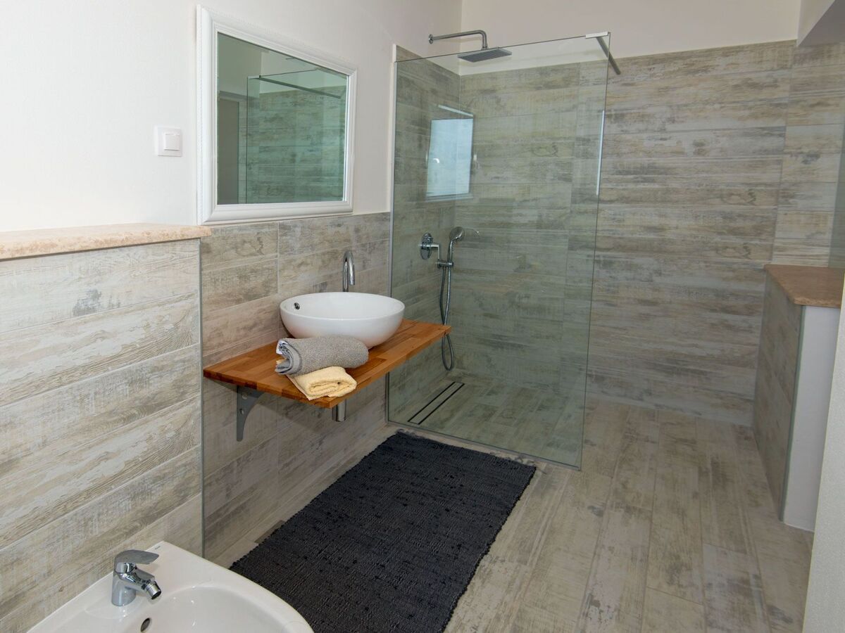 The lower floor of the villa comprises a total of three bedrooms, two with a double bed and an ensuite shower room, and one with two single beds and a bathroom next to it.