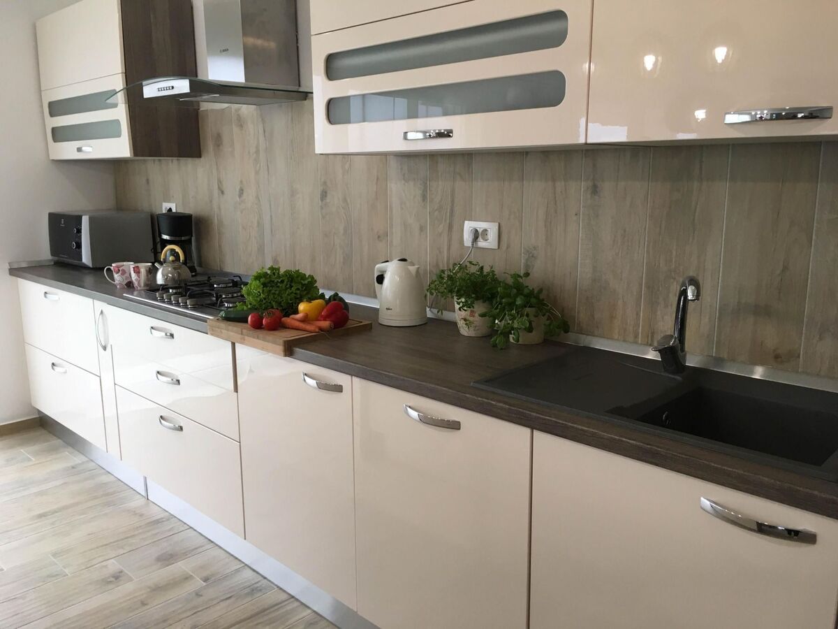 The modern kitchen block is fully-equipped and includes a dishwasher, a microwave and a coffee machine.