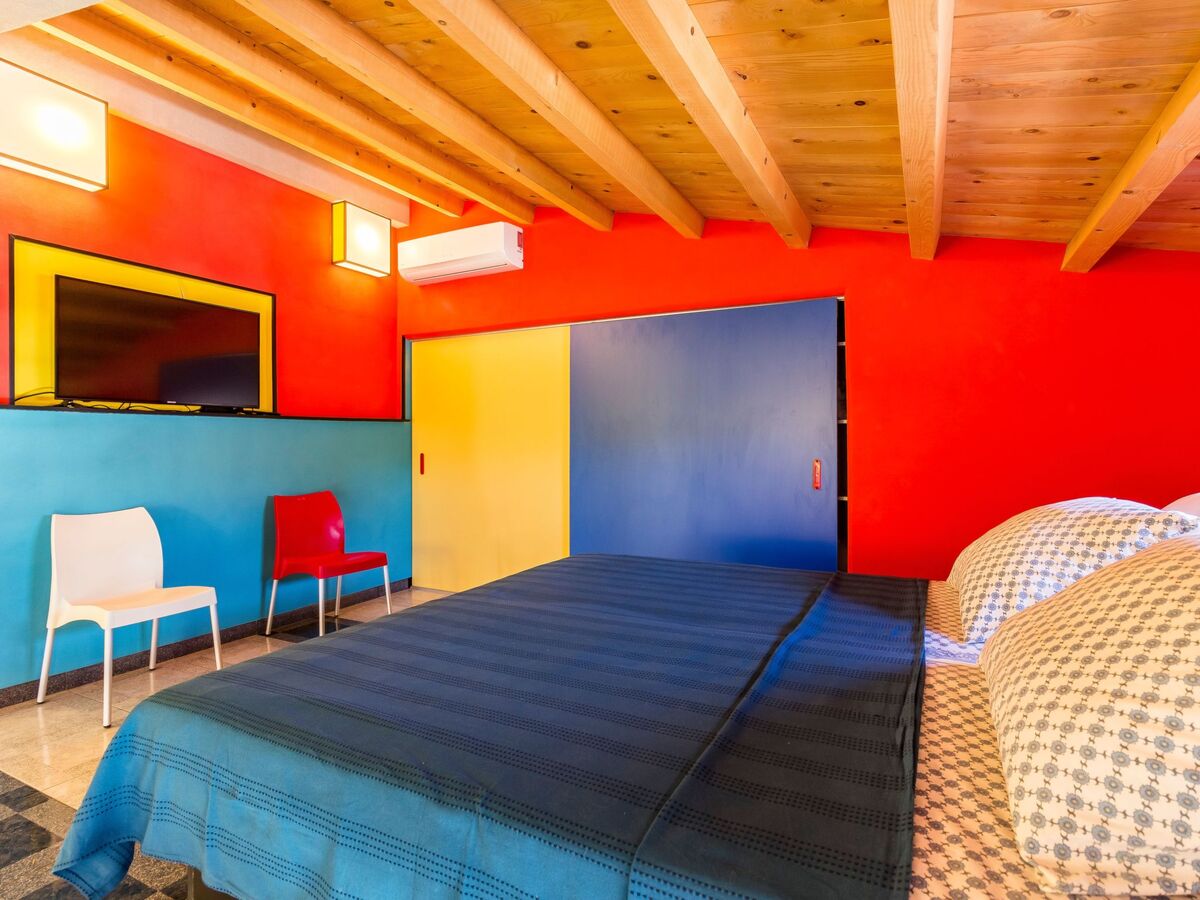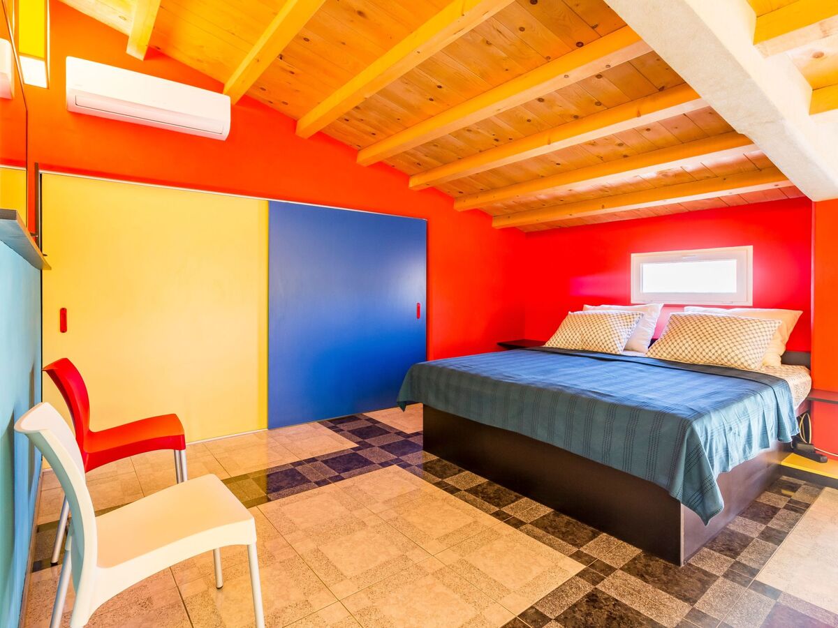 Open stairs lead up to the two bedrooms, the first furnished with a double bed 180cm wide, a spacious wardrobe with sliding doors and a large flatscreen TV, the second smaller bedroom with two single beds.