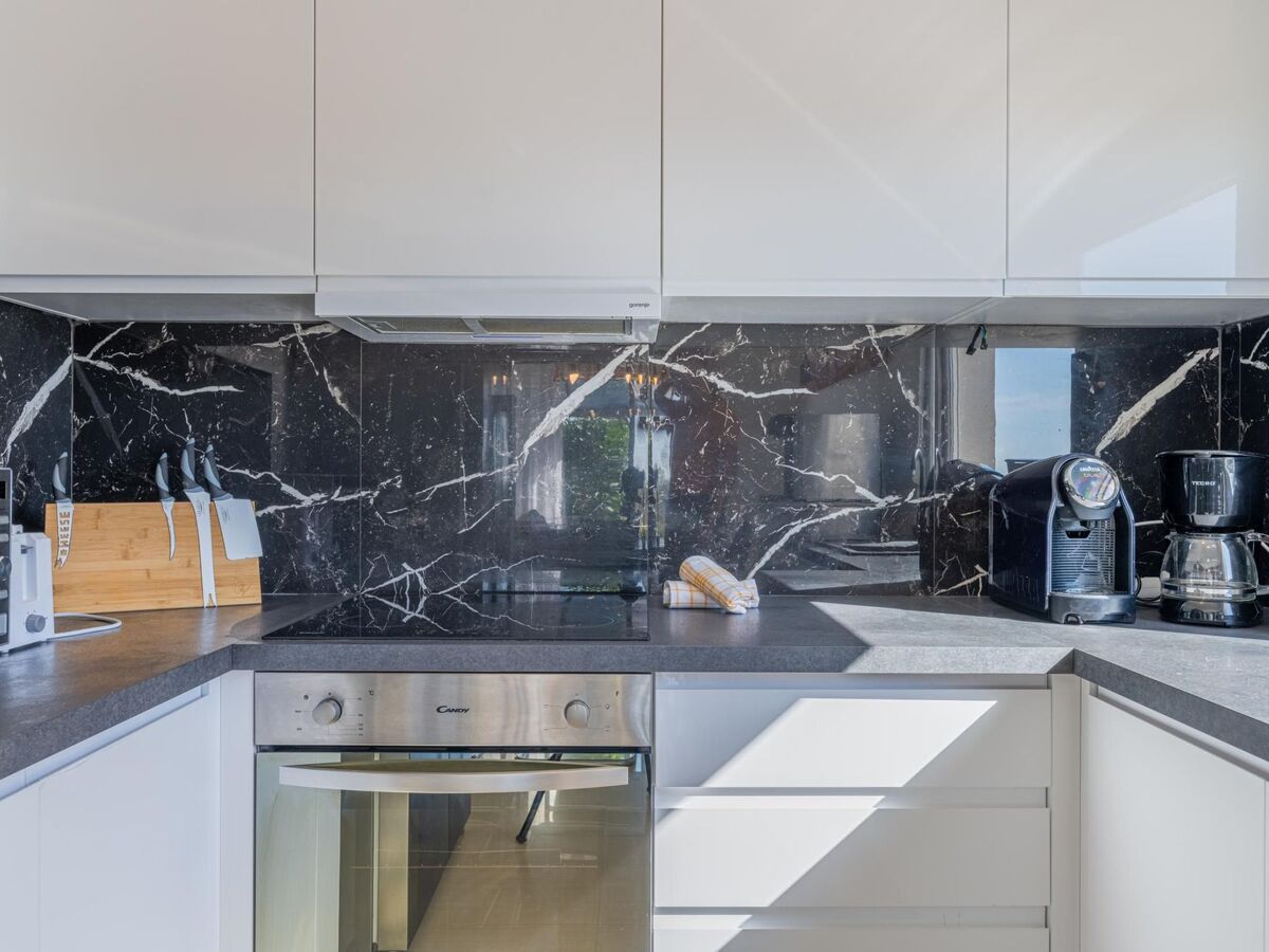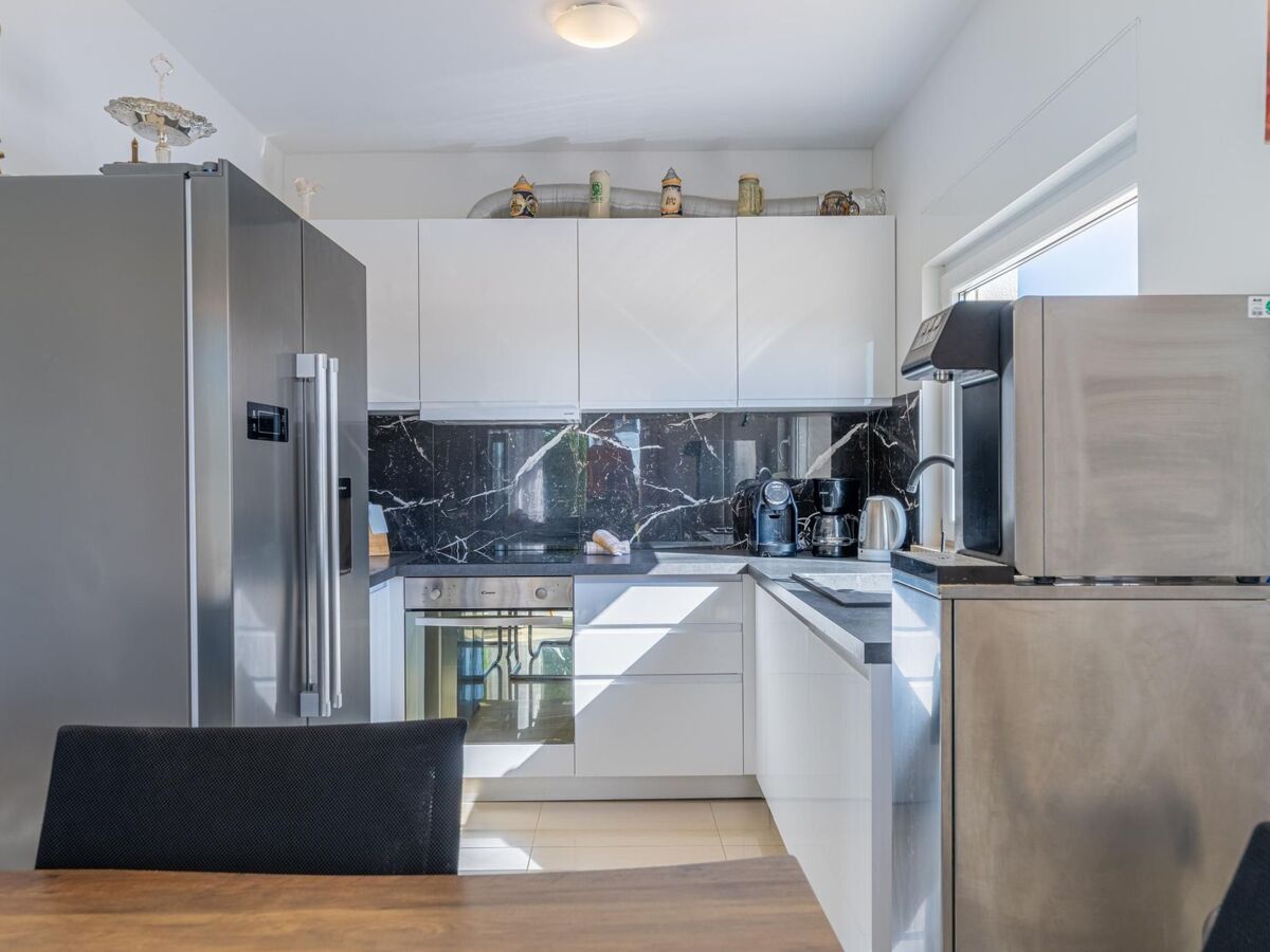 The kitchen is fully equipped with an oven, a large fridge, a freezer, a dishwasher, and a coffee machine.