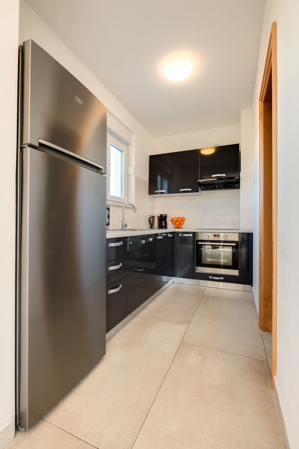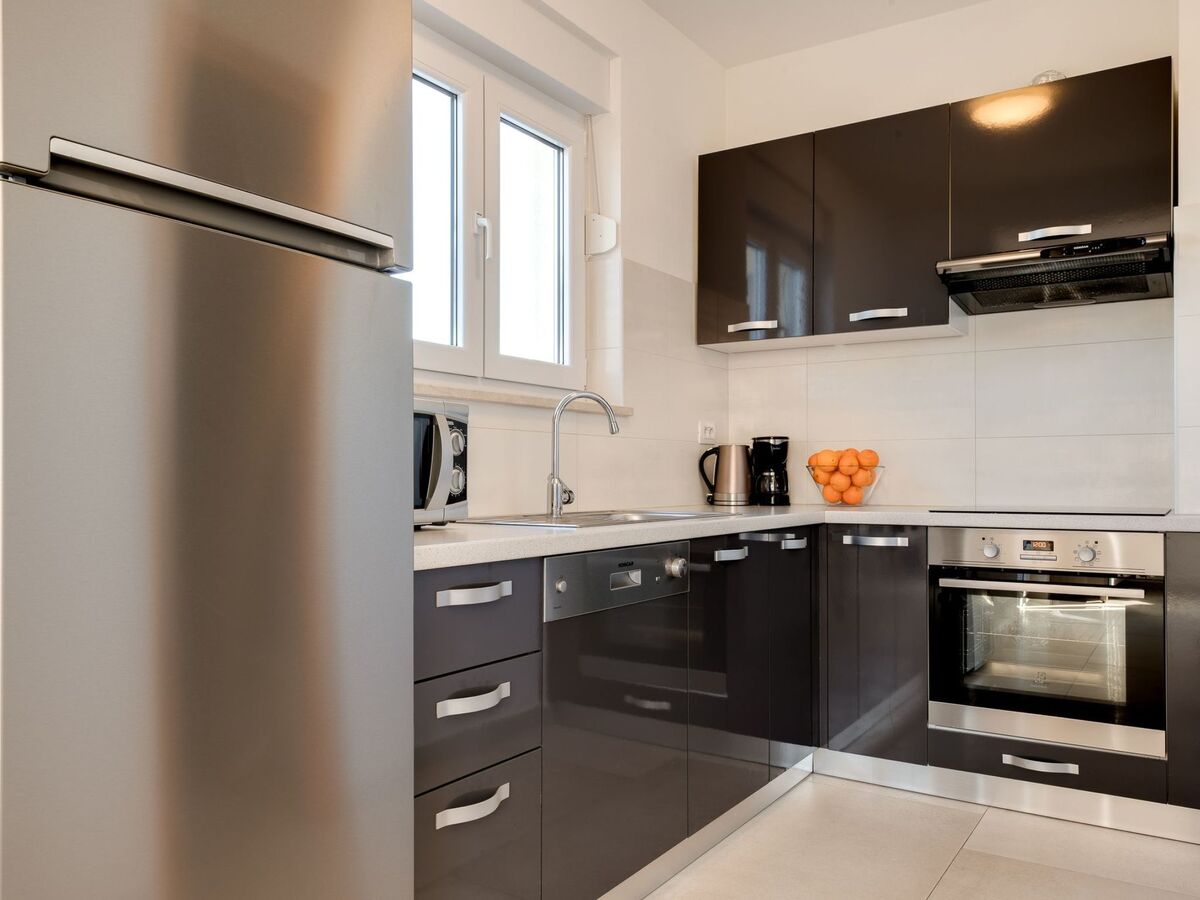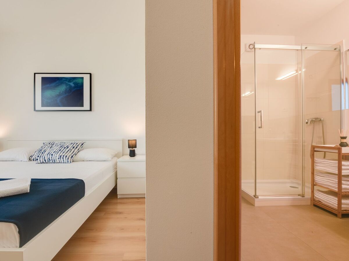 Il y a également une cuisine entièrement équipée avec un four à micro-ondes, une machine à café, un lave-vaisselle et un coin repas, ainsi qu'une salle de bains avec une douche.